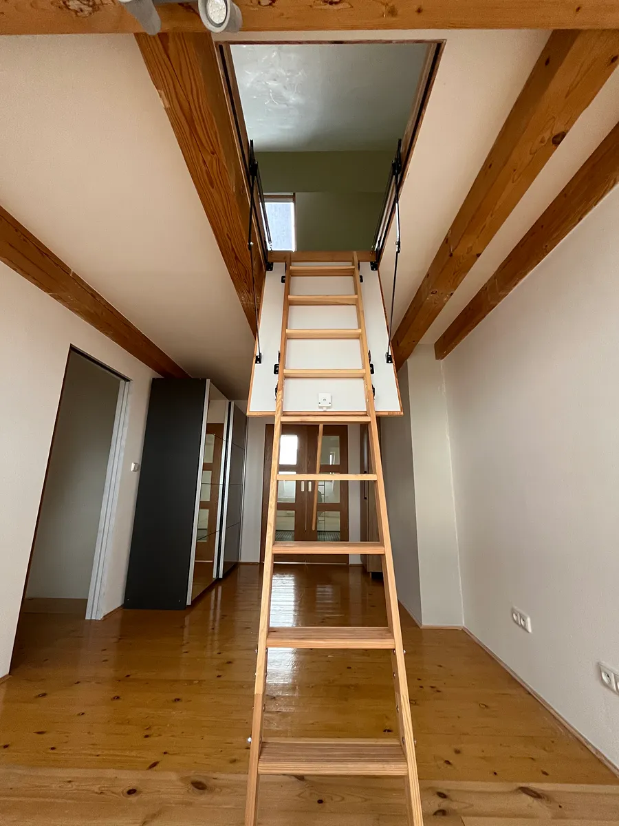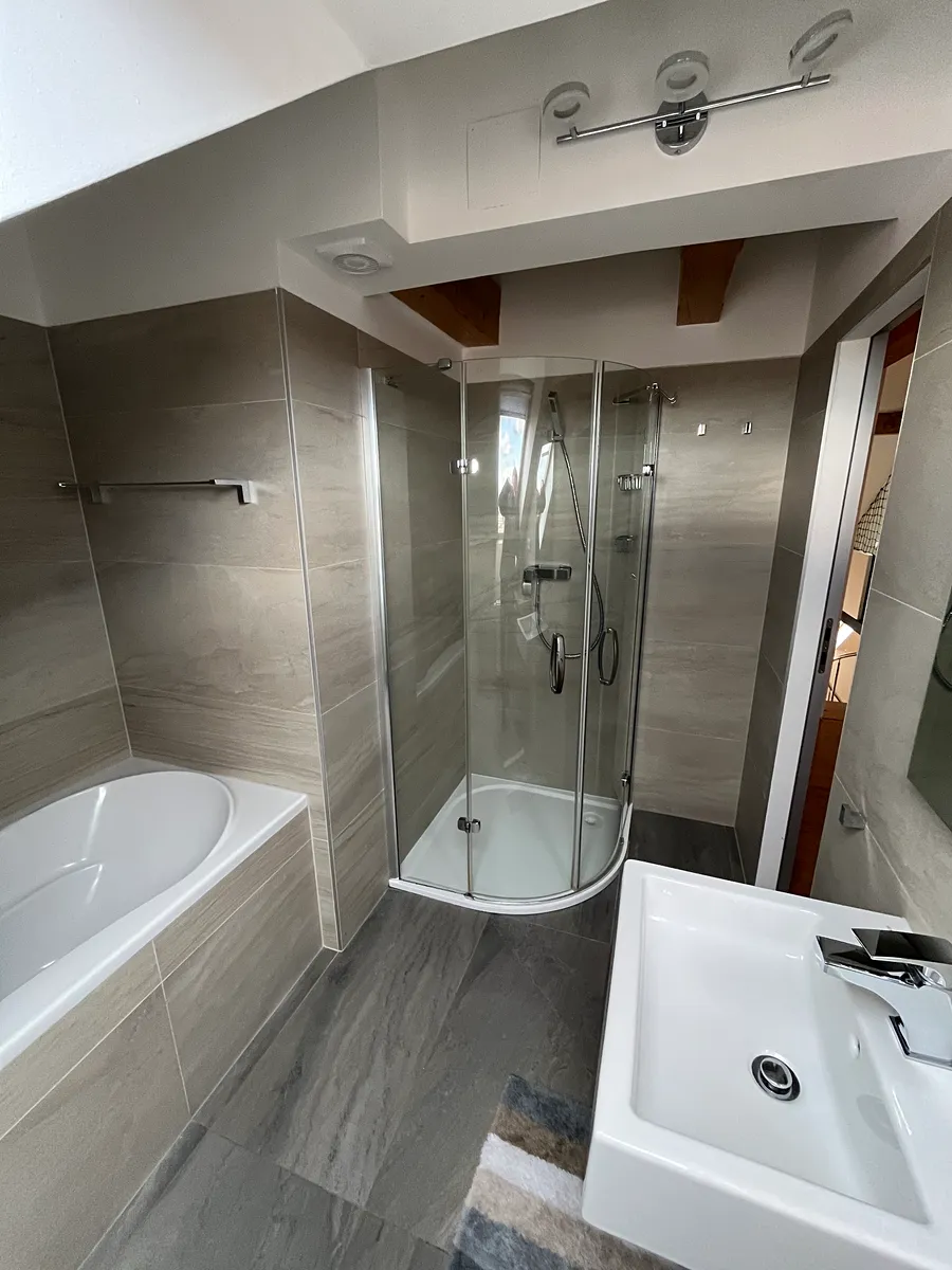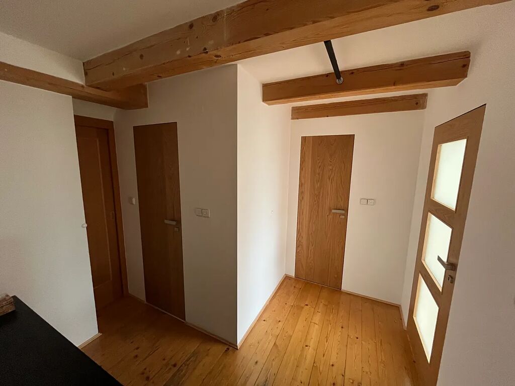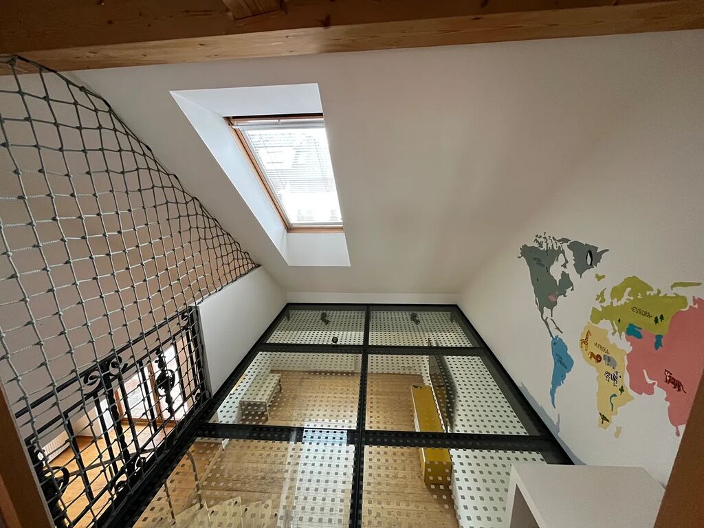 Přízemí nabízí prostorný obývací pokoj, samostatnou kuchyň s jídelní částí a vstupem na terasu. V dalším podlaží je ložnice, dětský pokoj s oddělenou částí ve které je prosklenou podlahou nad obývajícím pokojem, dále je zde samostatné wc a koupelna s vanou i sprchovým koutem. V bytě je ještě menší šatna a podkrovní místnost vhodná jako šatna, pracovna, atd. Díky mezonetovému uspořádání působí byt velmi vzdušně a poskytuje dostatek soukromí pro rodinu i jednotlivce.