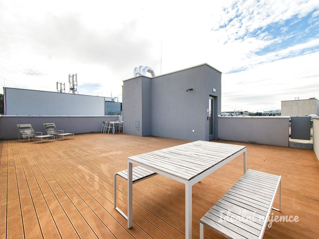 Byt se nabízí částečně vybavený (viz. fotogalerie), přičemž záleží na domluvě s majiteli, jaké vybavení v byte zůstane. Moderní kuchyňská linka disponuje lednicí, myčkou, elektrickou troubou, varnou deskou, mikrovlnnou troubou a digestoří. V ložnici je prostorná šatna. Dále je v bytě komora, která nabízí dostatek úložného prostoru. V koupelně je pračka. Obyvatelé domu mohou využívat společnou střešní terasu s panoramatickým výhledem do okolí.