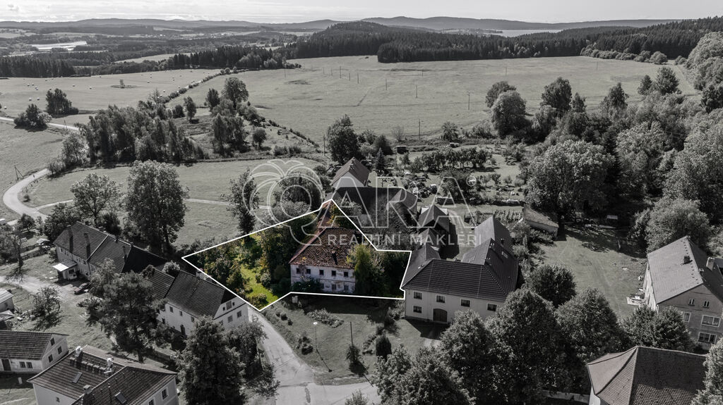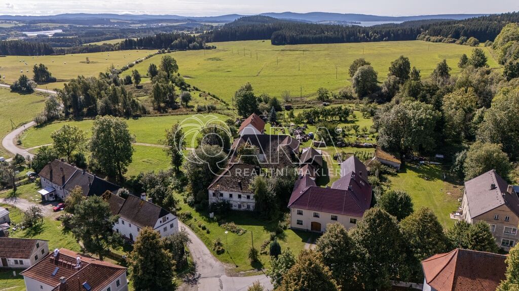 Na prodej zemědělská usedlost ve stavu před rekonstrukcí, umístěna přímo na návsi malé šumavské osady Hodňov, v těsném sousedství kostela Nejsvětější Trojice.