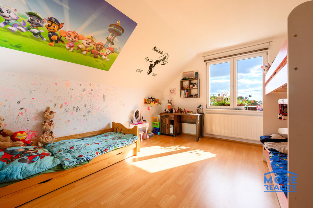 Podkroví: ložnice, dva dětské pokoje, koupelna s vanou a samostatné WC. Dřevěné schodiště dodává prostoru útulný charakter.