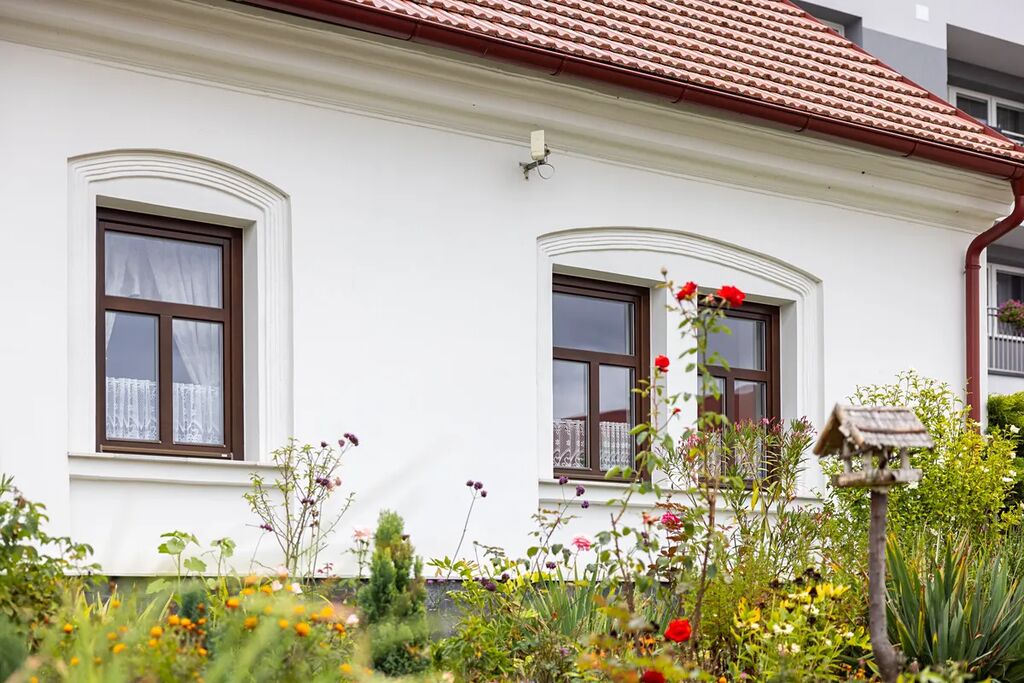 Dům obklopuje předzahrádka a prostorná zahrada plná kvetoucích záhonů, keřů a ovocných i okrasných stromů. Na pozemek je umožněn příjezd několika vjezdy.