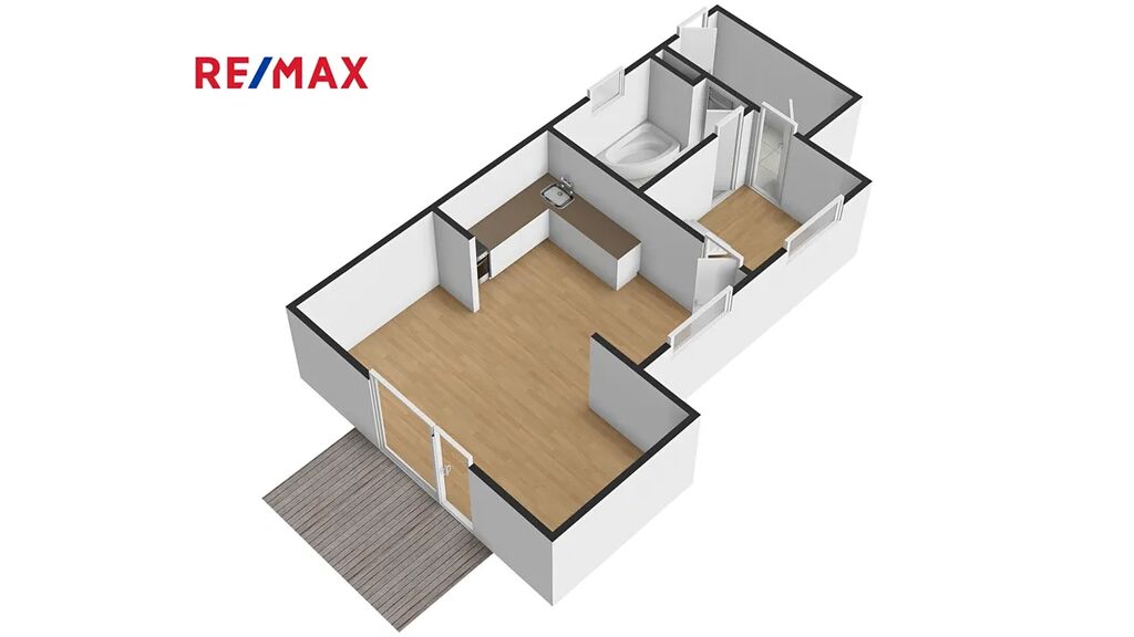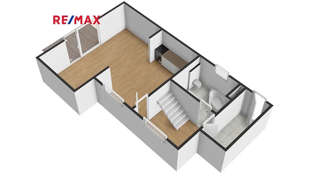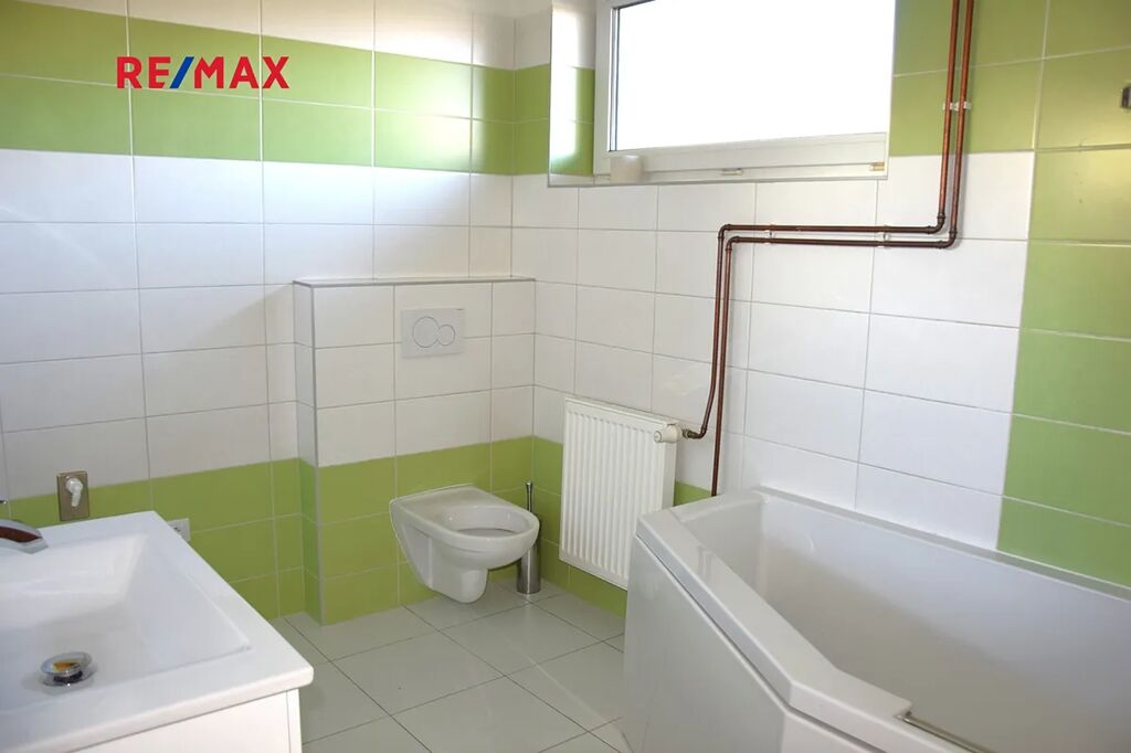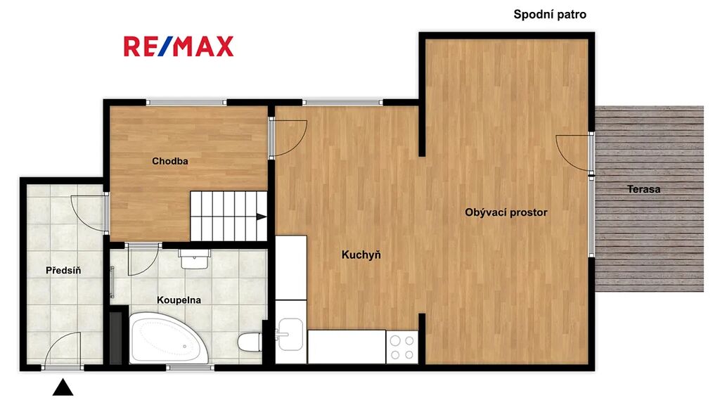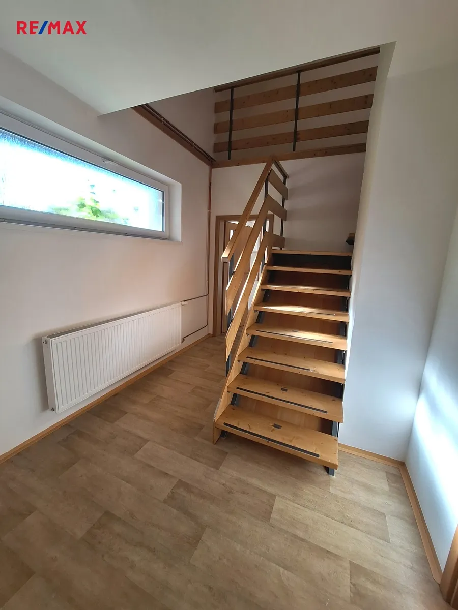 1. NP - vstupní předsíň, chodba se schodištěm do 2. NP, kuchyně, obývací pokoj se vstupem na terasu a zahradu, prostorná koupelna s WC.