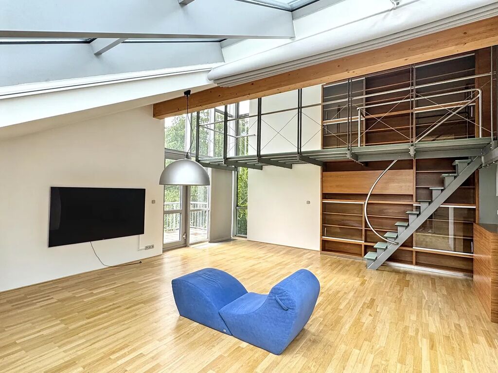 Čtvrté – nejvyšší – patro funguje jako samostatné studio s vlastním vstupem na terasu s panoramatickým výhledem na Prahu. Disponuje ložnicí, kuchyňským koutem, šatnou i koupelnou a je ideální pro dvougenerační bydlení nebo zázemí pro hosty. Prostor je skvěle osvětlen ateliérovými okny a mohl by inspirovat pro tvorbu uměleckých děj i dalších projektů.
