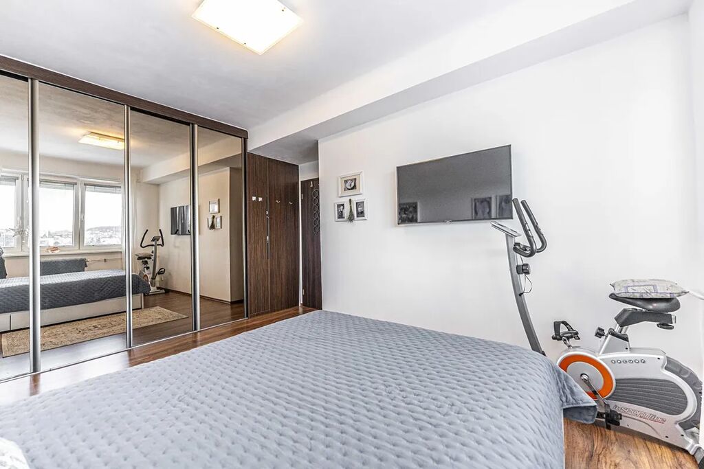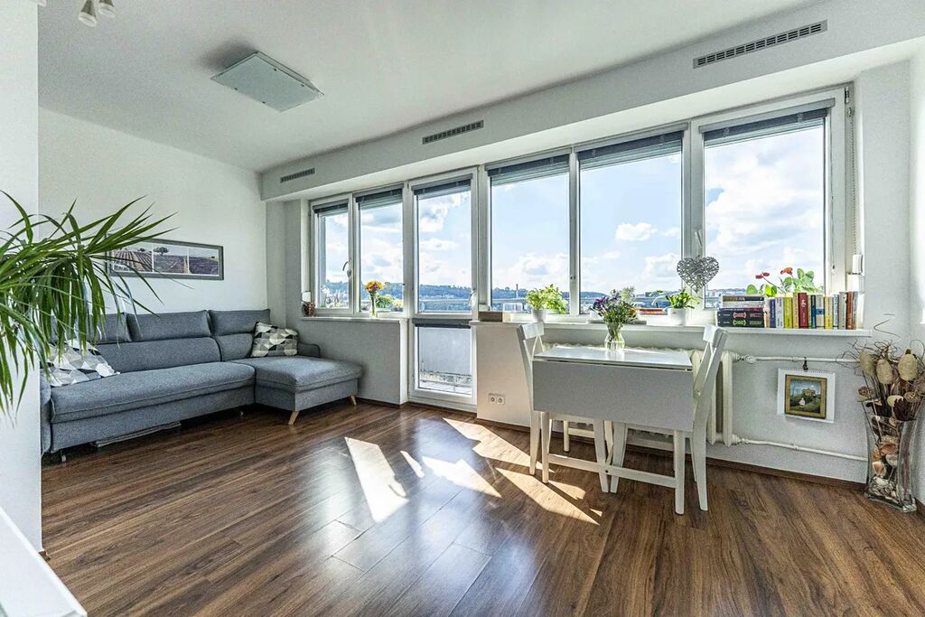 Byt s celkovou podlahovou plochou cca 53 m2 a balkonem (cca 5 m2) prošel velmi povedenou rekonstrukcí před cca 5 lety vč. rozvodů apod. Věříme, že Vás zaujme provedení úprav, barevná kompozice kombinující světlé a tmavší prvky, dostatek úložných prostor atd. Byt je velmi slunný se západní orientací, ve vyšším patře s nádhernými výhledy na okolí, případné horké dny během léta řeší předokenní žaluzie. V bytě je v případě přání provedena příprava na instalaci klimatizace. Na podlahách je skládaná dřevěná podlaha a dlažba. Nová plastová okna.