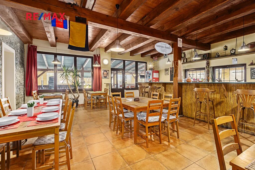✅ Přízemí je vybaveno pro gastro provoz – velká místnost s barem a 32 místy, sociální zařízení, zázemí pro personál, kuchyně, technická místnost a sklad. Celková plocha je 114,09 m2. K restauraci přiléhá ze severní a východní strany zastřešená terasa s plochou 81 m2. Terasa má kapacitu 50 až 70 míst pro hosty. Další stoly mohou být v letních měsících umístěny na plochy před restaurací.
