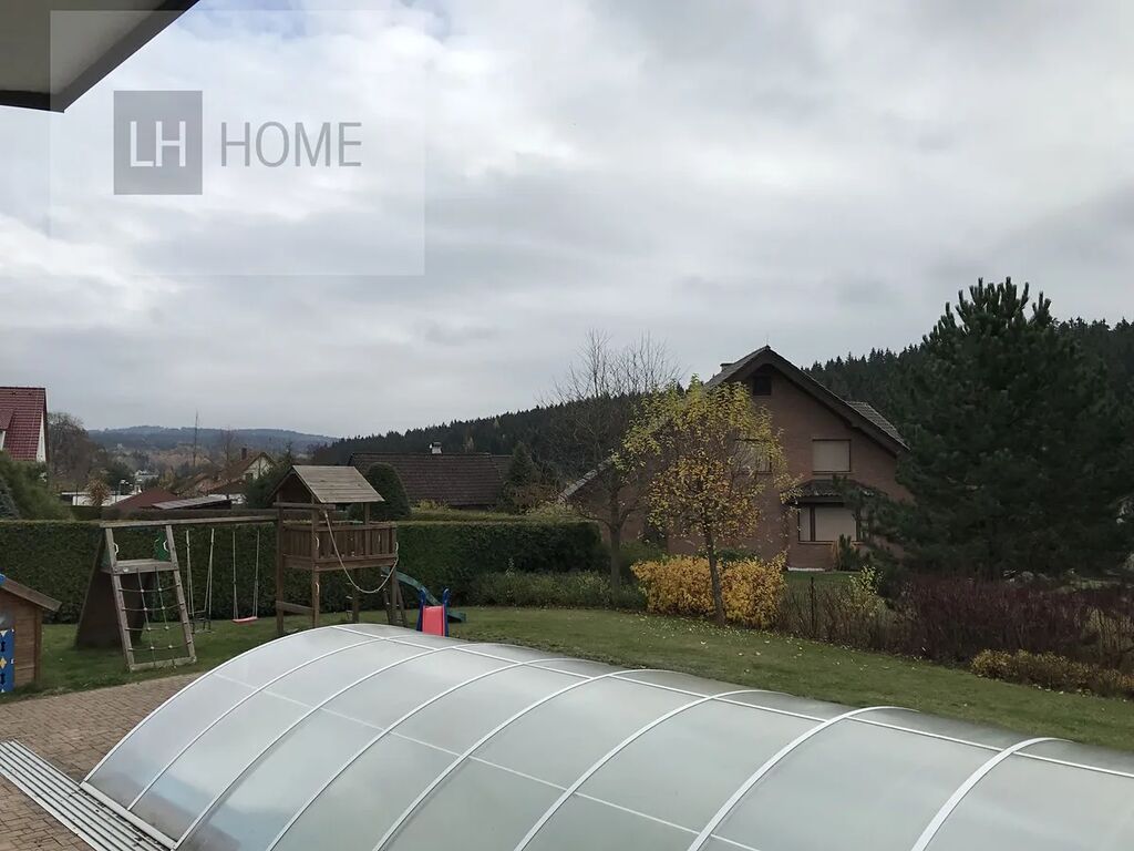 Zahrada je okrasná se zastřešeným bazénem a vířivkou.