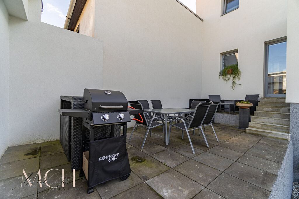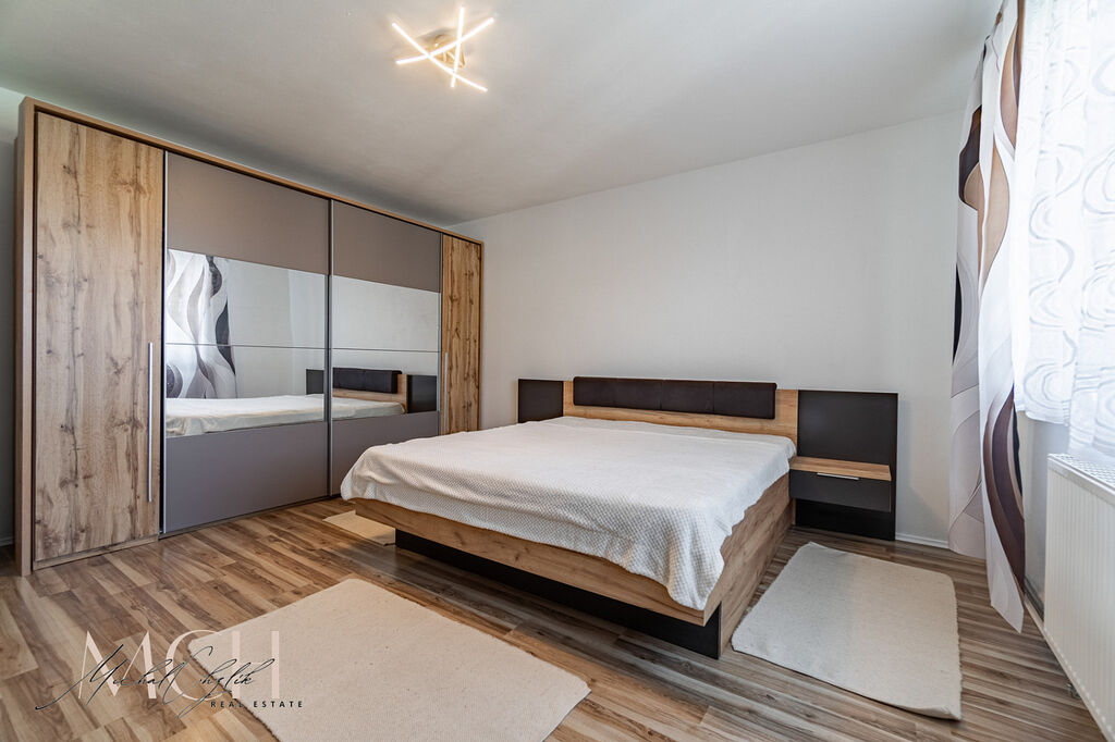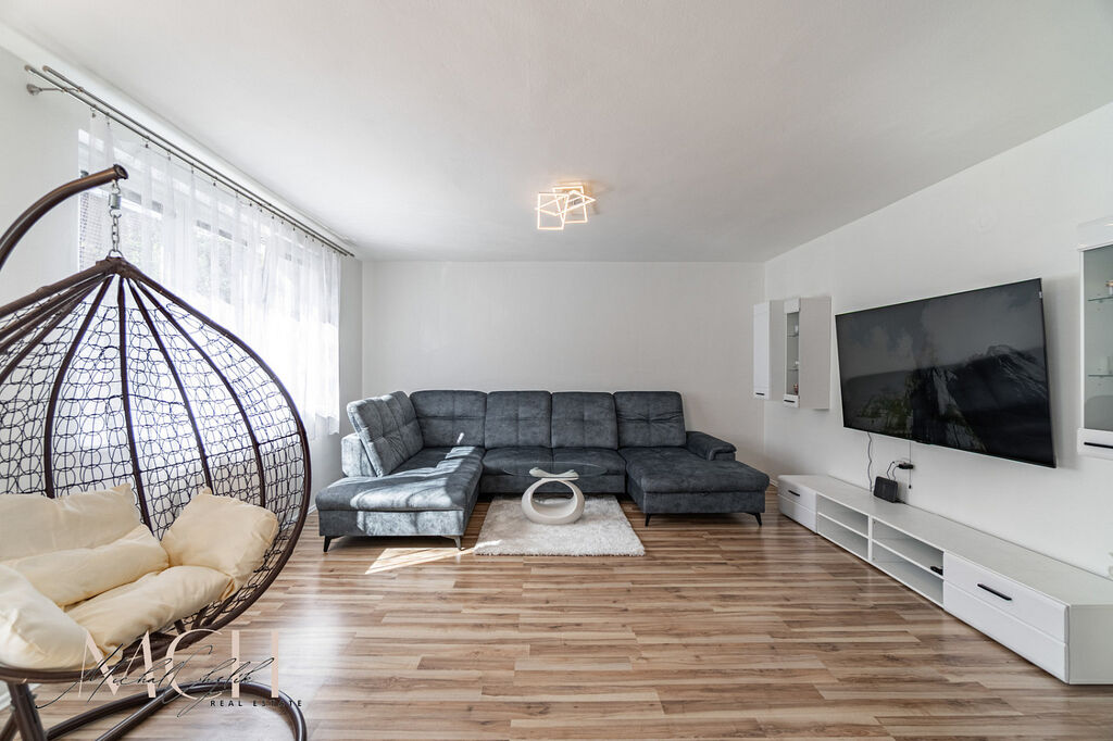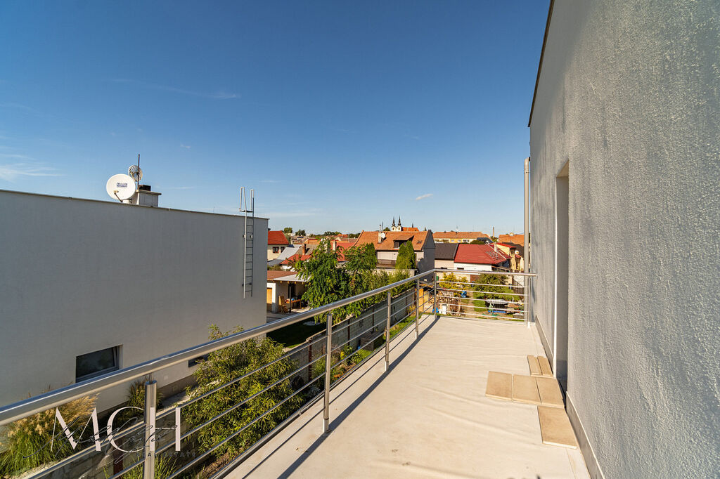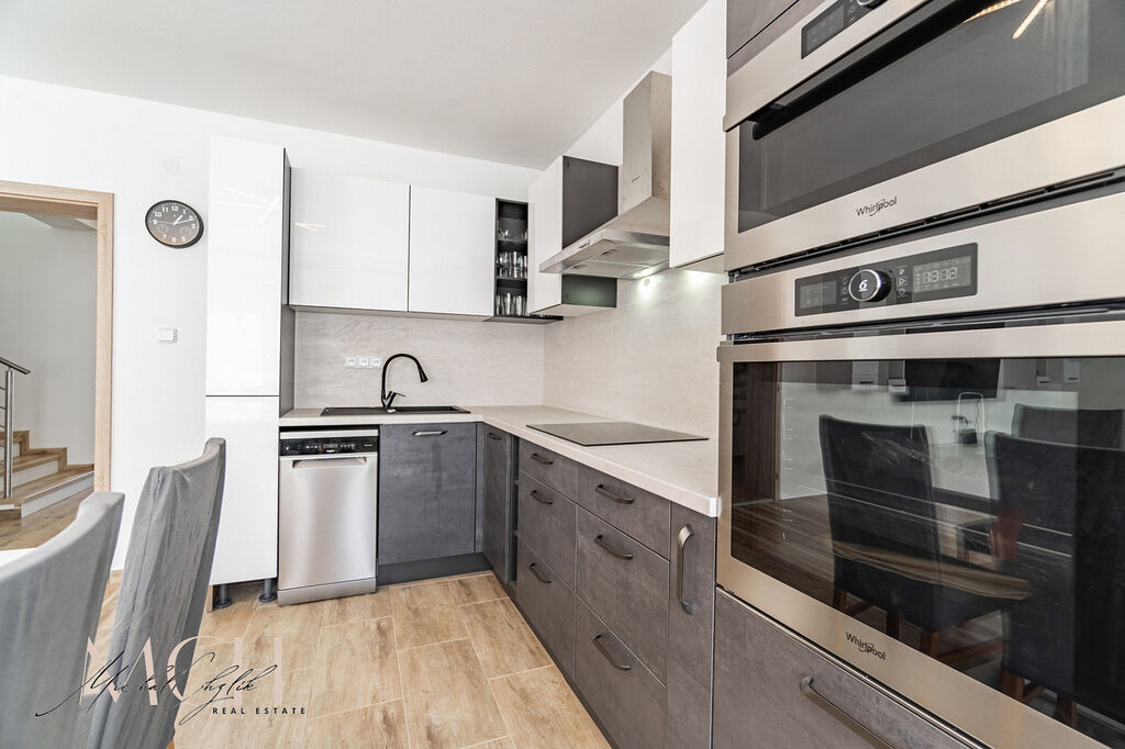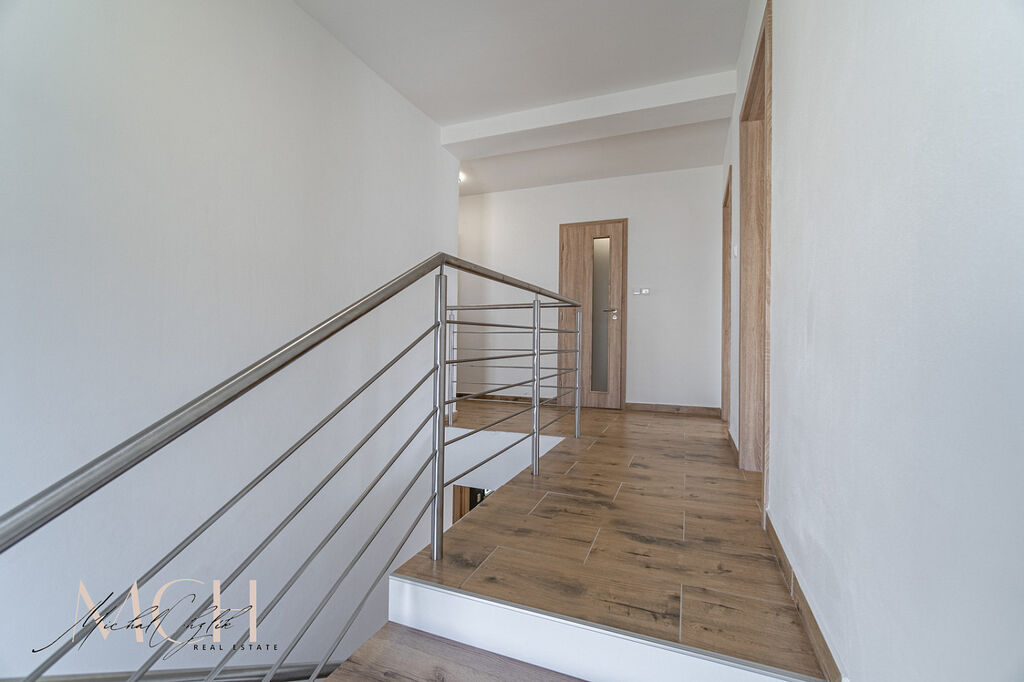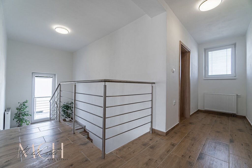V přízemí vás přivítá velkorysý obývací pokoj s moderně vybavenou kuchyní a jídelnou. Dále je zde ložnice s výhledem do zahrady, koupelna s toaletou a praktický sklad. Z mezipatra je přístupná první slunná terasa. V patře najdete tři samostatné pokoje se vstupem na terasu, koupelnu s toaletou a šatnu, kterou lze využít i jako pracovnu.
