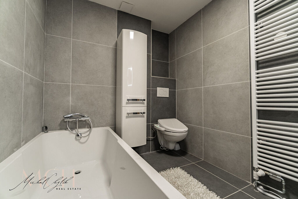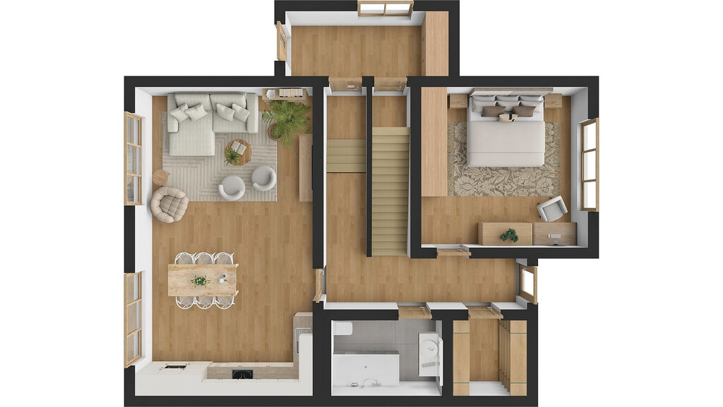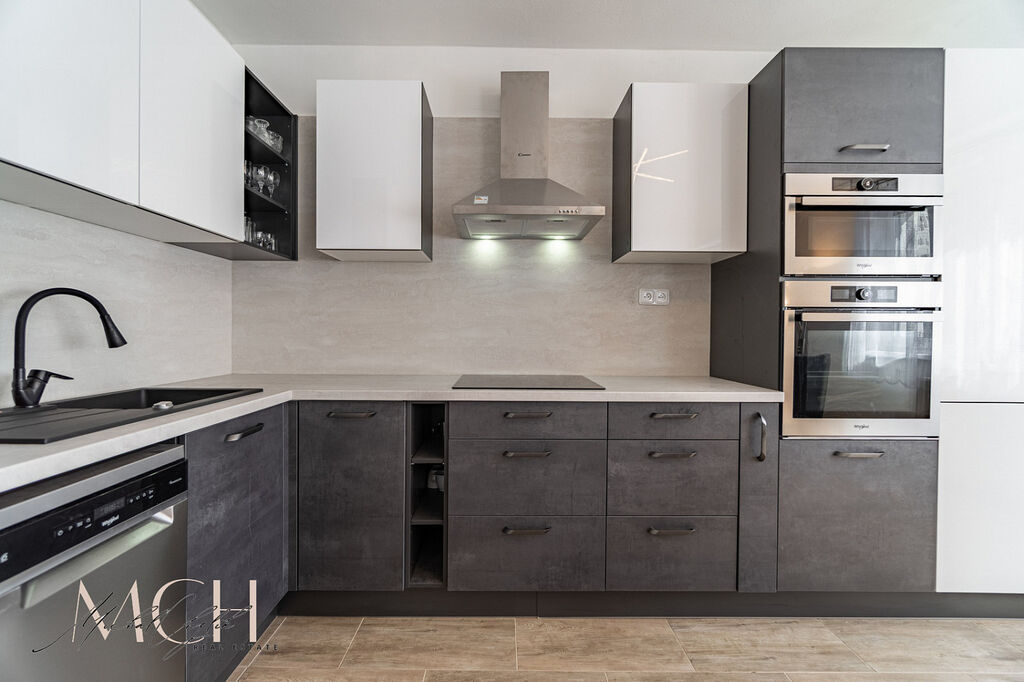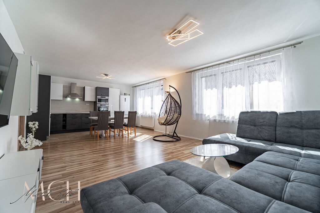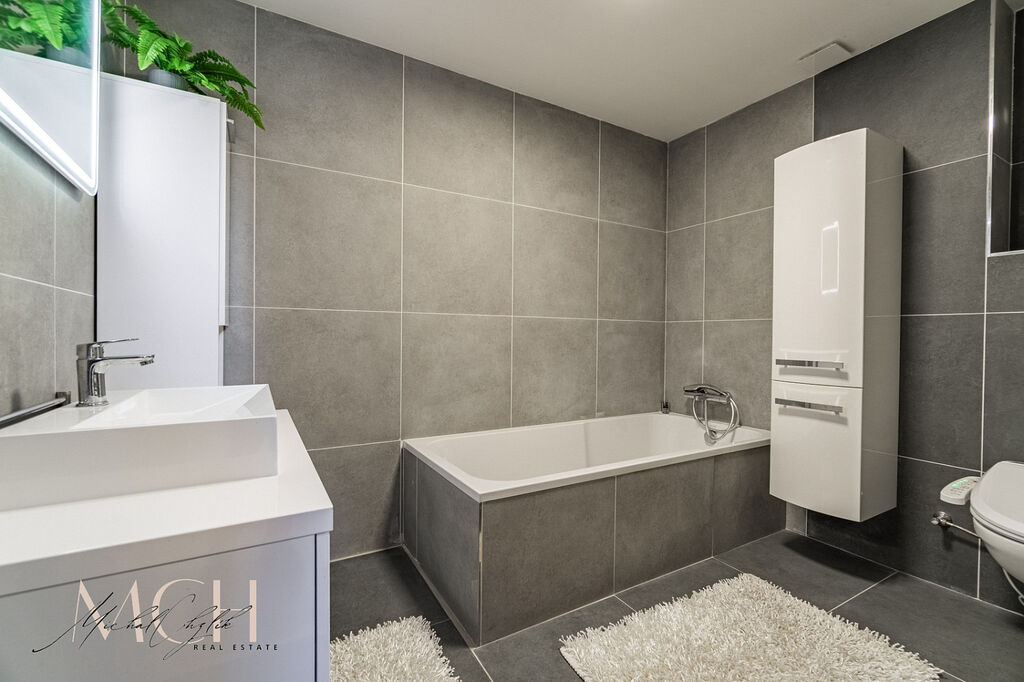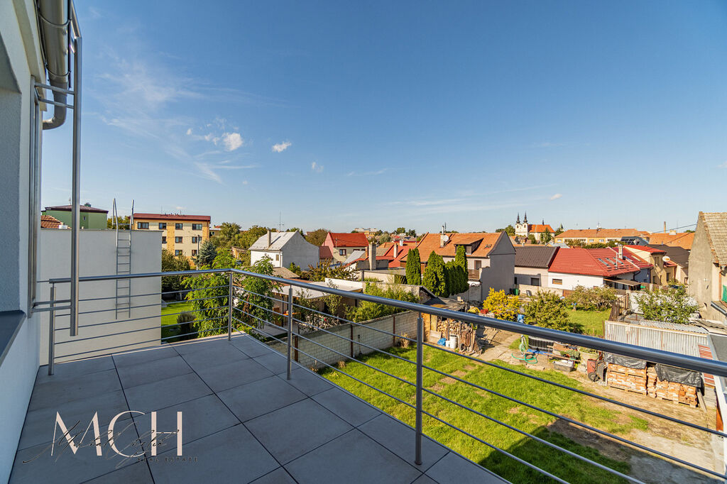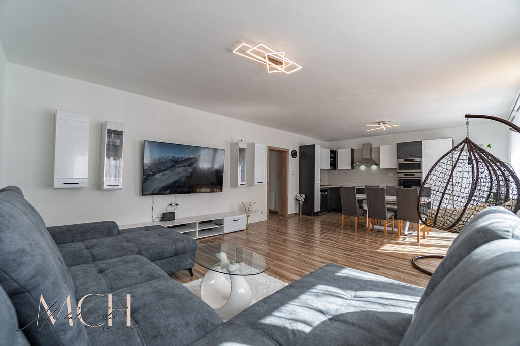 V přízemí vás přivítá velkorysý obývací pokoj s moderně vybavenou kuchyní a jídelnou. Dále je zde ložnice s výhledem do zahrady, koupelna s toaletou a praktický sklad. Z mezipatra je přístupná první slunná terasa. V patře najdete tři samostatné pokoje se vstupem na terasu, koupelnu s toaletou a šatnu, kterou lze využít i jako pracovnu.
