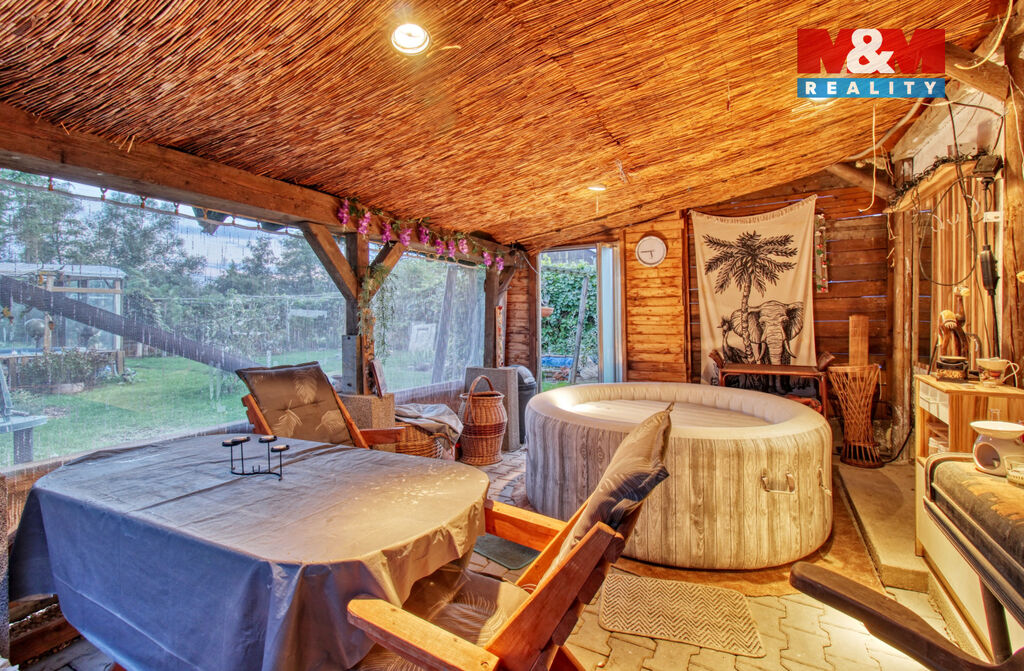 Na udržované zahradě se nachází zastřešené posezení s vířivkou a grilem, menší zastřešený bazén, dřevník, skleník a ovocné stromy také nechybí. Pro zábavu i relax tedy máte vše přímo doma.