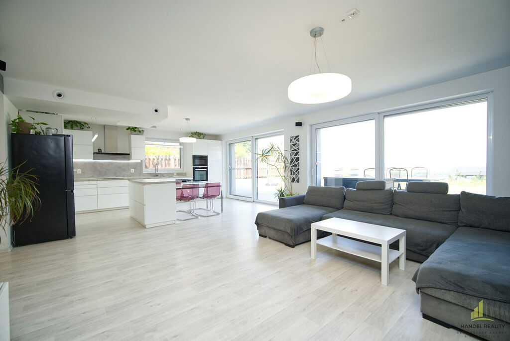 Společné chvíle si můžete užívat v prostorném obývacím pokoji propojeném s kuchyní a jídelnou. Tyto místnosti jsou prosvětlené velkými francouzskými okny se vstupem na zahradu. Terasa orientovaná na sever nabízí příjemné posezení s výhledem do okolní přírody – ideální pro klidné večery nebo grilování s přáteli.