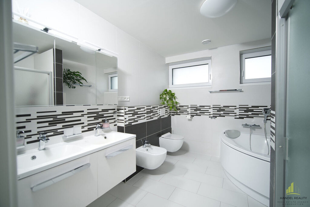 Použité materiály a technologie jsou nadstandardní – podlahové topení, interiérové obložky a dveře, sprchové kouty, předokenní žaluzie, retenční nádrž o objemu 12 m³, změkčovač vody, cirkulace teplé vody, chytré osvětlení či příprava na centrální vysavač.