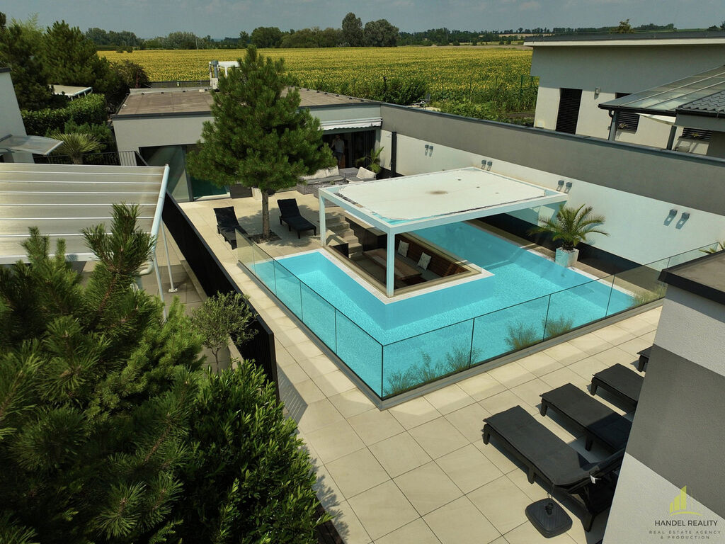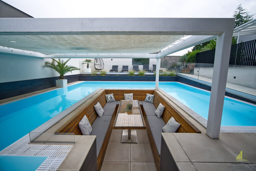 Tato impozantní vila, s celkovou zastavěnou plochou 365 m² a rozlehlým pozemkem o velikosti 1350 m², je obklopena moderním stylem, palmami a prázdninovou atmosférou. Prostorný bazén, který se večer mění v osvětlenou dominantu celého objektu, nabízí ideální místo pro odpočinek a zábavu. V případě nepříznivého počasí můžete využít saunu, velkou vířivku nebo si dopřát degustaci vín v elegantně zařízeném vinném sklípku.
