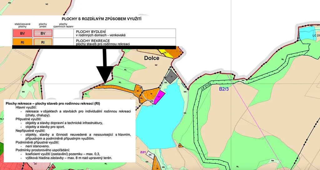 Na jednom z pozemků (391 m²) se nachází chata o zastavěné ploše 25 m², vedená v územním plánu jako plocha rekreace (RI), což umožňuje výstavbu nového rekreačního objektu dle stanovených regulativů: