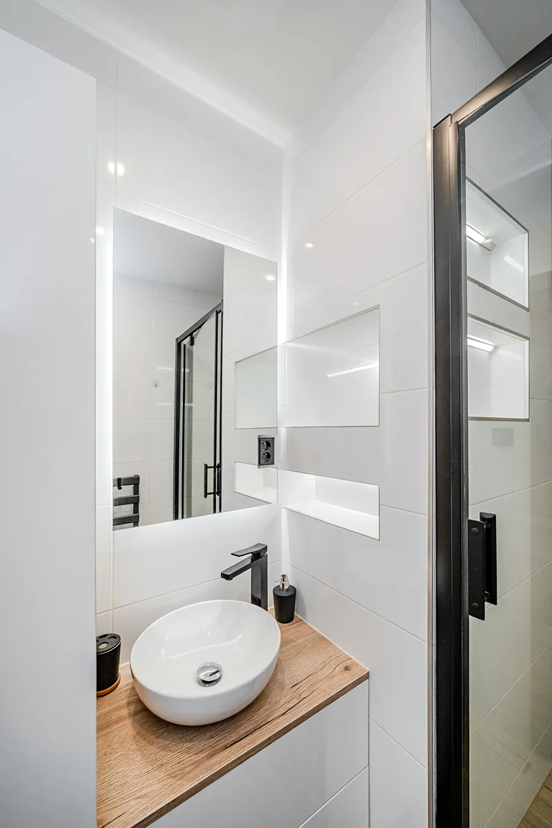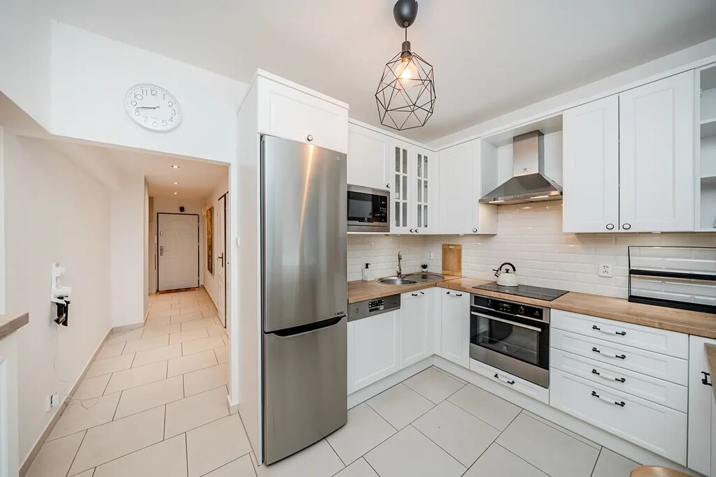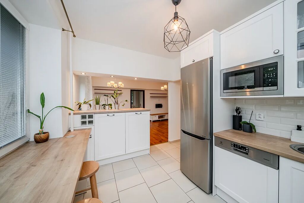 Byt prošel v letech 2017 až 2022 nákladnou rekonstrukci a byl obýván minimálně. V části bytu jsou nové rozvody elektra, podlaha je pokrytá dlažbou, plovoucí podlahou a kobercem. V chodbě a ložnici se nacházejí prostorné, vestavěné šatní skříně. Jsou zde sádrové omítky (s vyjimkou ložnice), nové dveře i zárubně.V části bytu jsou snížené stropy se zabudovaným osvětlením. Jádro je zděné. Koupelna je v moderních obkladech, s sprchovým koutem a umyvadlem. Toaleta je samostatná. Vedle toalety je zděná komora. Dominantou bytu je prostorná kuchyně s linkou na míru a vestavěnými spotřebiči (indukční varná deska, myčka, digestoř, varná trouba – vše Electrolux. Lednice je značky LG). Kuchyně je opravdu prostorná, s velkými úložnými prostory a stolem. Kuchyni od obývacího pokoje odděluje ostrůvek. Obývací pokoj je prostorný a je průchozí s ložnicí. Dětský pokoj je samostatný. V chodbě a kuchyni se nachází velkoformátová dlažba. Byt je laděný do světlých, moderních tónů. V chodbě je dostatek prostoru, který byl využit na vestavěnou šatní skříň i botník. K bytu patří prostorný, zděný sklep.