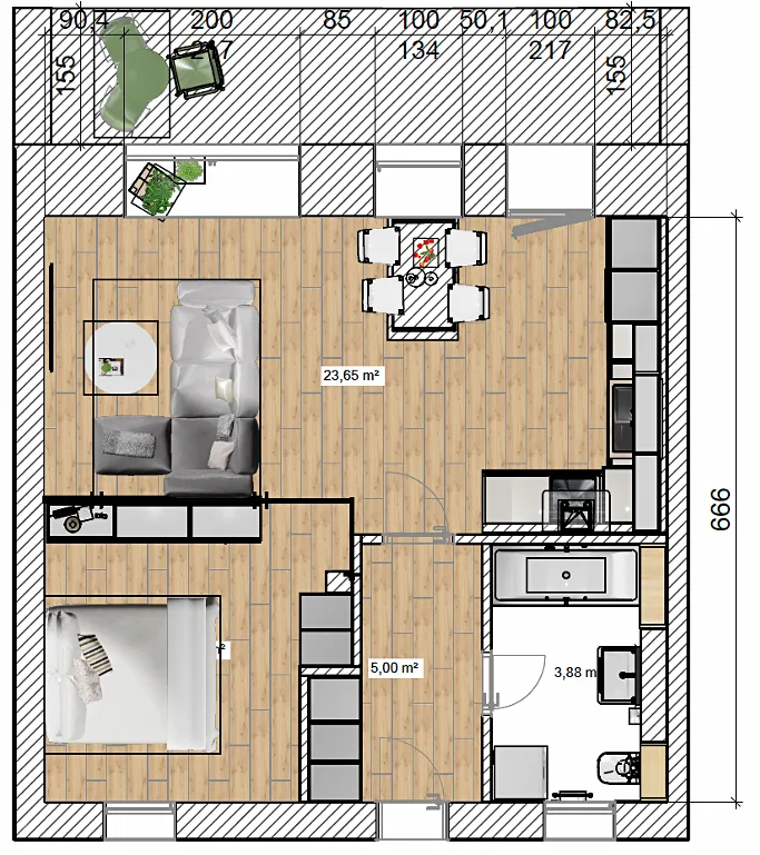 Byt je dispozičně řešen jako prostorný obytný prostor s kuchyňským koutem a částečně oddělenou spací částí. Moderní kuchyňská linka vyrobená na míru je vybavena všemi vestavnými spotřebiči v nejvyšší kvalitě – indukční varnou deskou, troubou, mikrovlnnou troubou, myčkou a vestavnou lednicí. Koupelna je vybavena prostorným sprchovým koutem, pisoárem, toaletou a topným žebříkem. Vstupní chodba je zařízena botníkem, zrcadlem a věšákem přičemž jednu stěnu zdobí designové dřevěné lamely. Spací kout je elegantně oddělen skleněnou příčkou, která zajišťuje soukromí a zároveň zachovává vzdušnost prostoru. Veškerý nábytek v bytě je vyroben na míru s důrazem na kvalitu a design, součástí vybavení je mimo jiné pohodlná postel a vkusné dekorace. Okenní otvory jsou osazeny elektrickými zatemňovacími roletami pro maximální komfort.