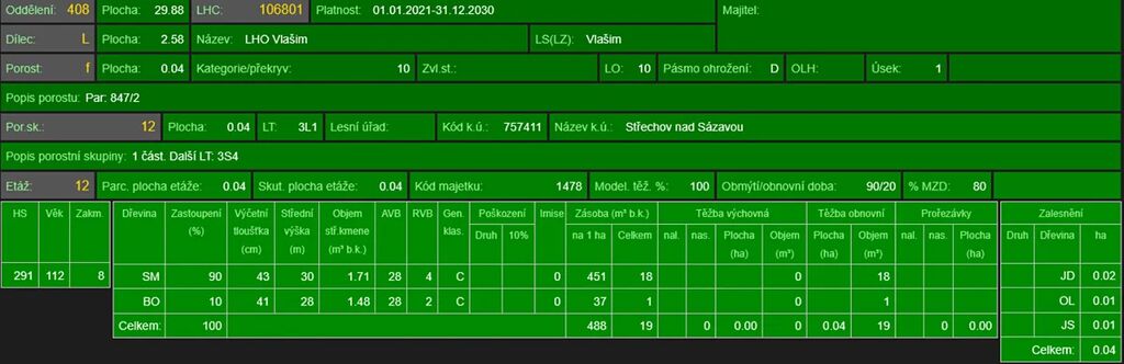 - p.č. 664/2 o celkové výměře 886 m2 vedená jako lesní pozemek (stáří lesa 139 let - zastoupení dřevin je borovice, modřín)