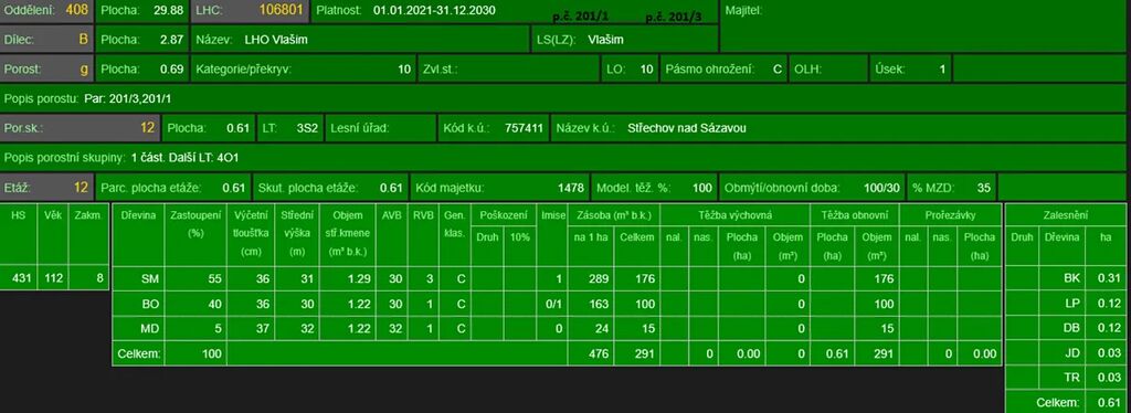- p.č. 201/3 o celkové výměře 2 553 m2 vedená jako lesní pozemek (stáří lesa 116 let- zastoupení dřevin je smrk, borovice, modřín, stáří lesa 26 let - zastoupení dřevin smrk, modřín)- starý porost vytěžen po kalamitní těžbě,