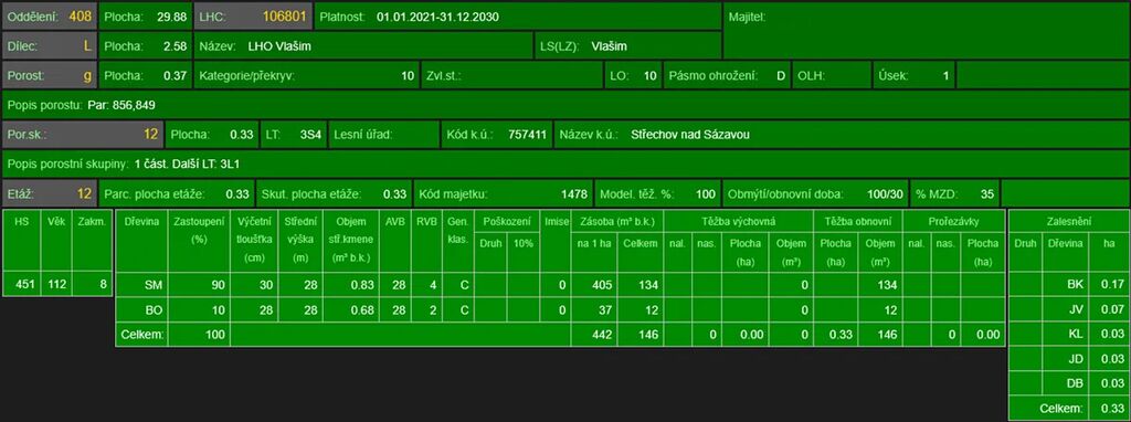- p.č. 856 o celkové výměře 500 m2 vedená jako lesní pozemek (stáří lesa 116 let - zastoupení dřevin je smrk, borovice, stáří lesa 25 let - zastoupení dřevin je smrk),