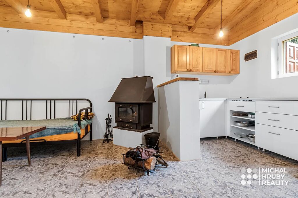 Nechybí ani koupelna se sprchovým koutem a samostatná toaleta. Hlavním zdrojem tepla je krb, nicméně k dispozici budete mít i elektrický radiátor. Chata má vlastní studnu, odpady jsou svedeny do plastové žumpy s objemem 4 m3.