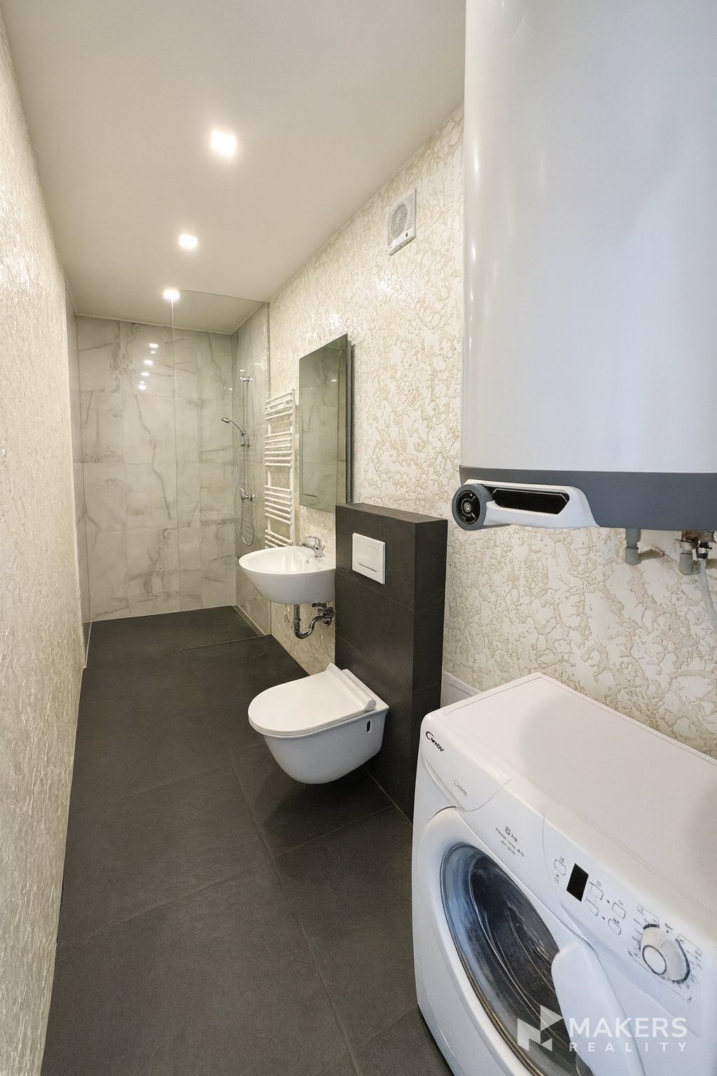 Interiér se skládá z prostorného obývacího pokoje propojeného s plně vybavenou kuchyňskou linkou (myčka, varná deska, trouba, digestoř, lednice) a velké ložnice orientované do tiché ulice. Obě místnosti jsou laděny ve světlých tónech a pokryty kvalitní parketovou podlahou. V koupelně je sprchový kout, toaleta, pračka, podlahové vytápění a žebříkový radiátor. Byt je ideální příležitostí pro ty, kteří si chtějí prostor zařídit dle vlastních představ.