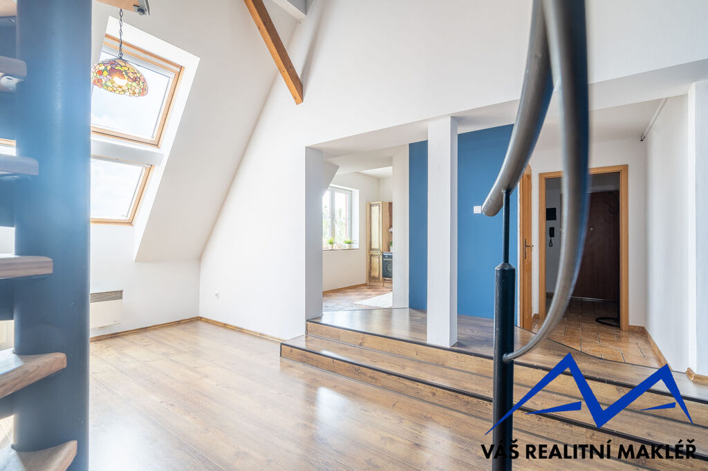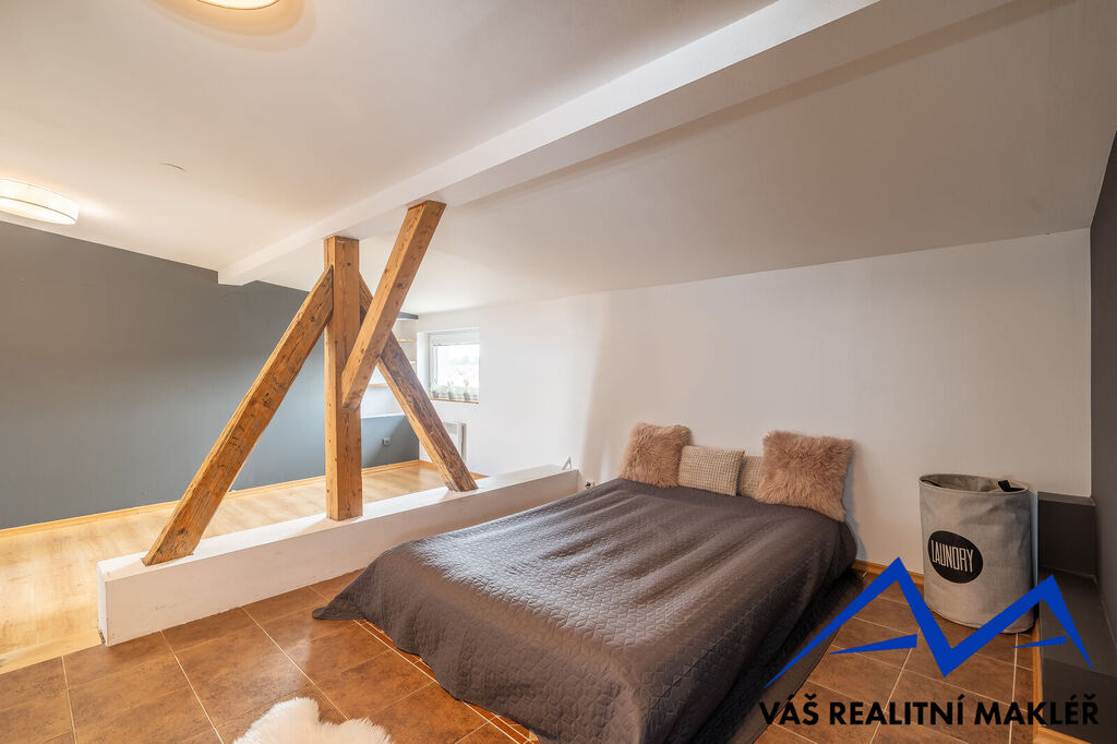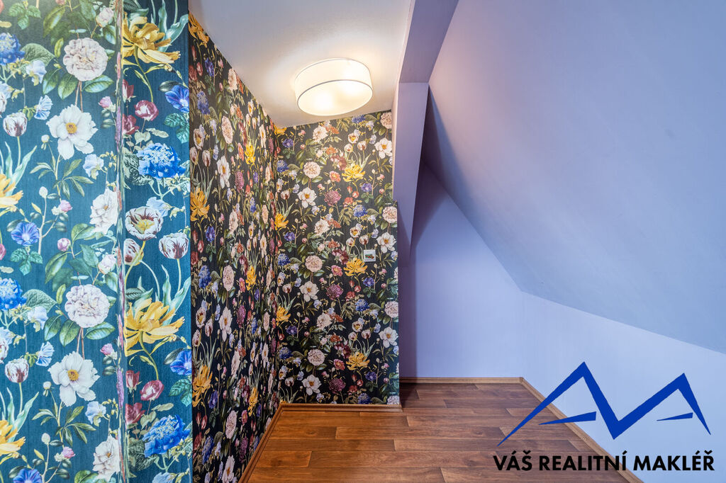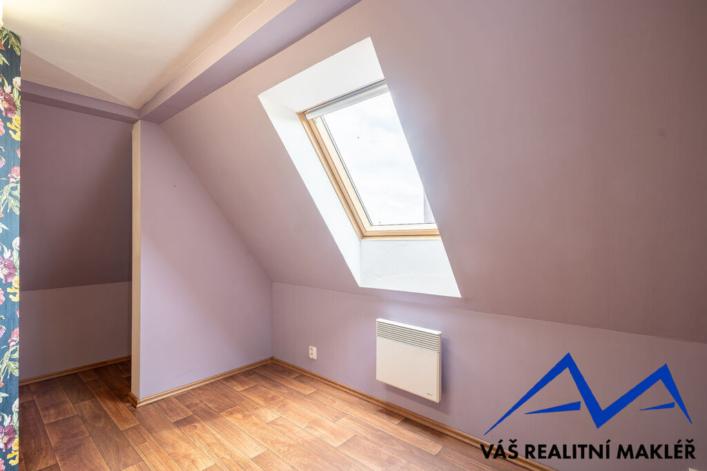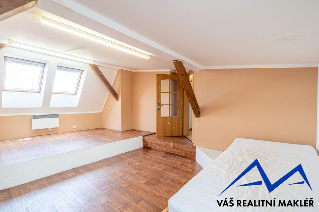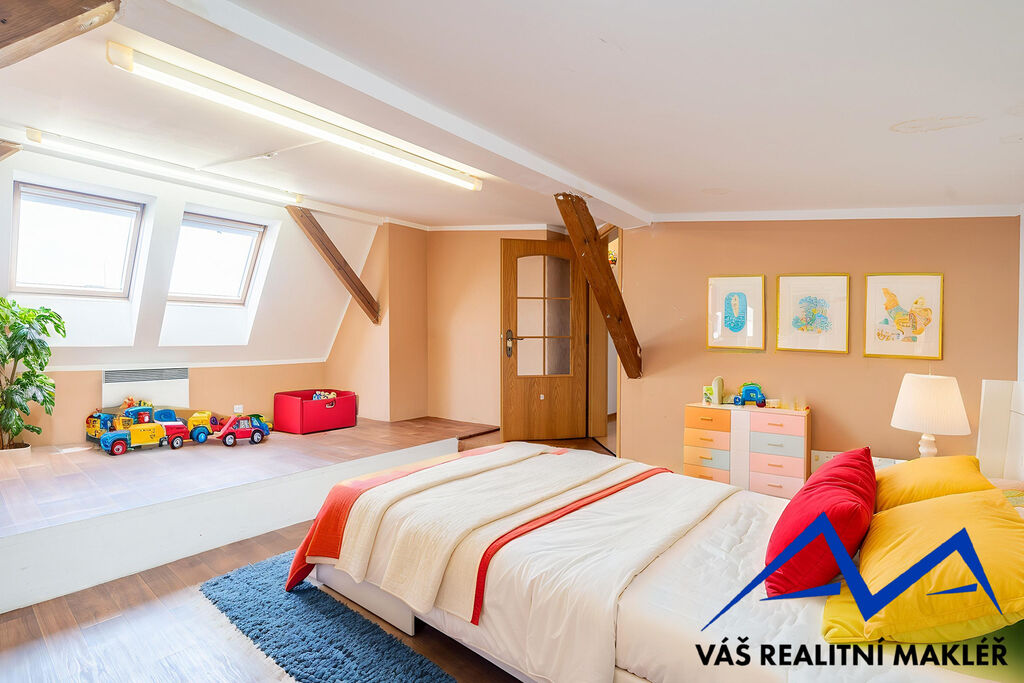 2. patro bytu - obývací pokoj, koupelna s vanou a WC, ložnice, šatna, 2x pokoj, 2x půdní prostor.