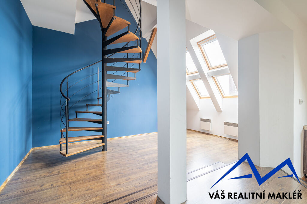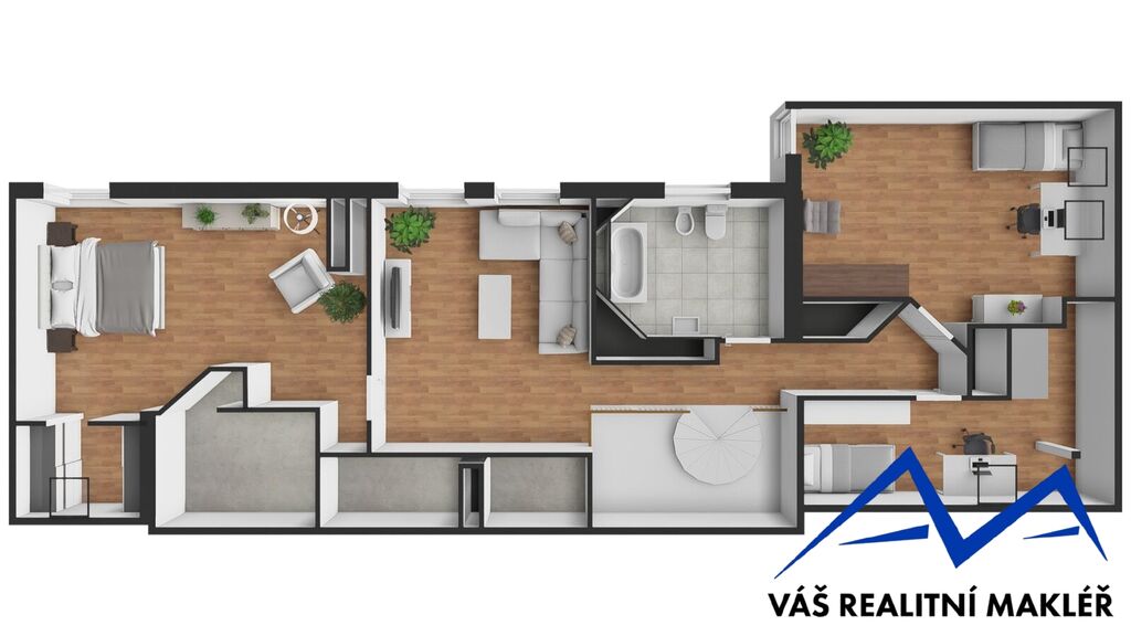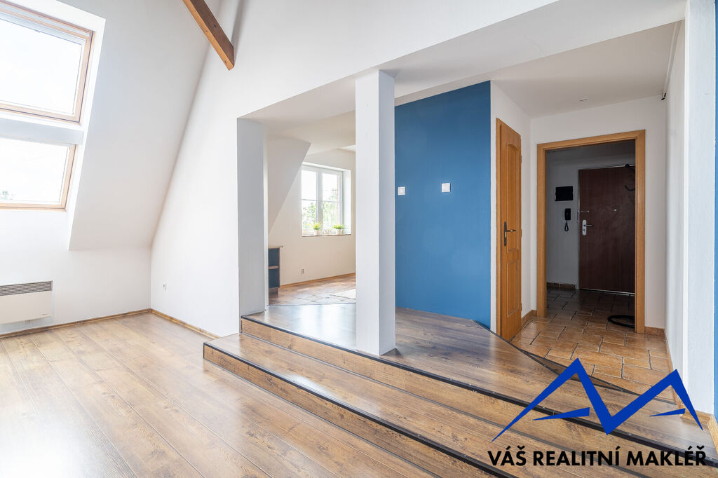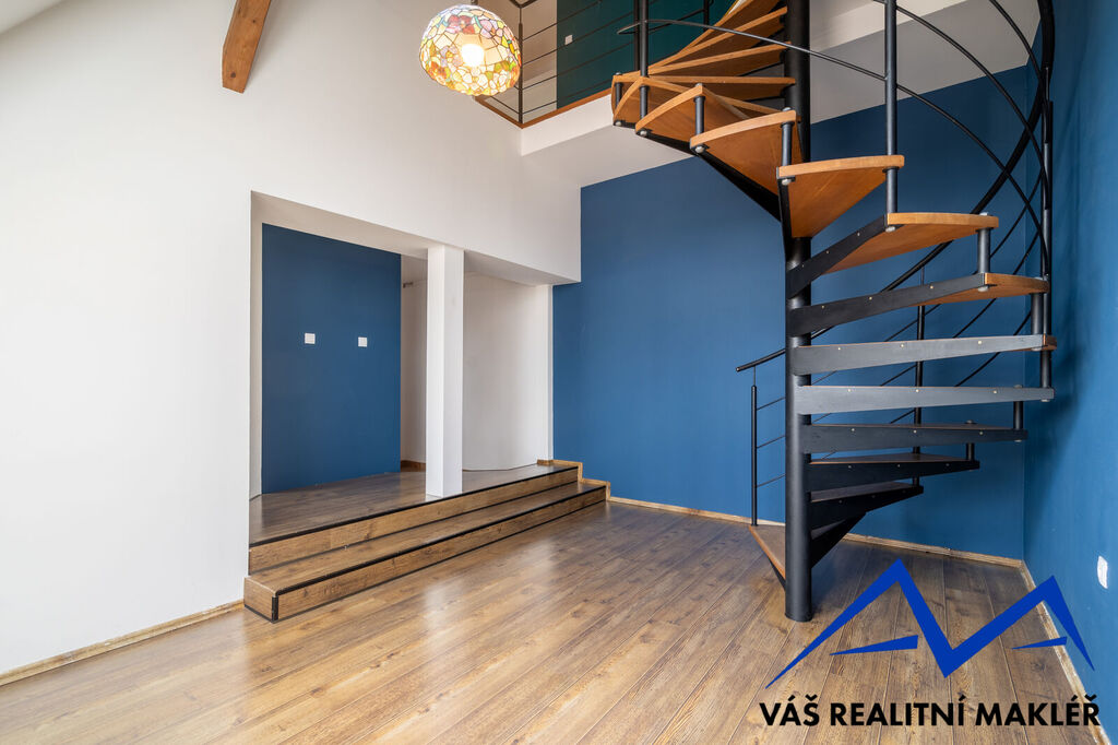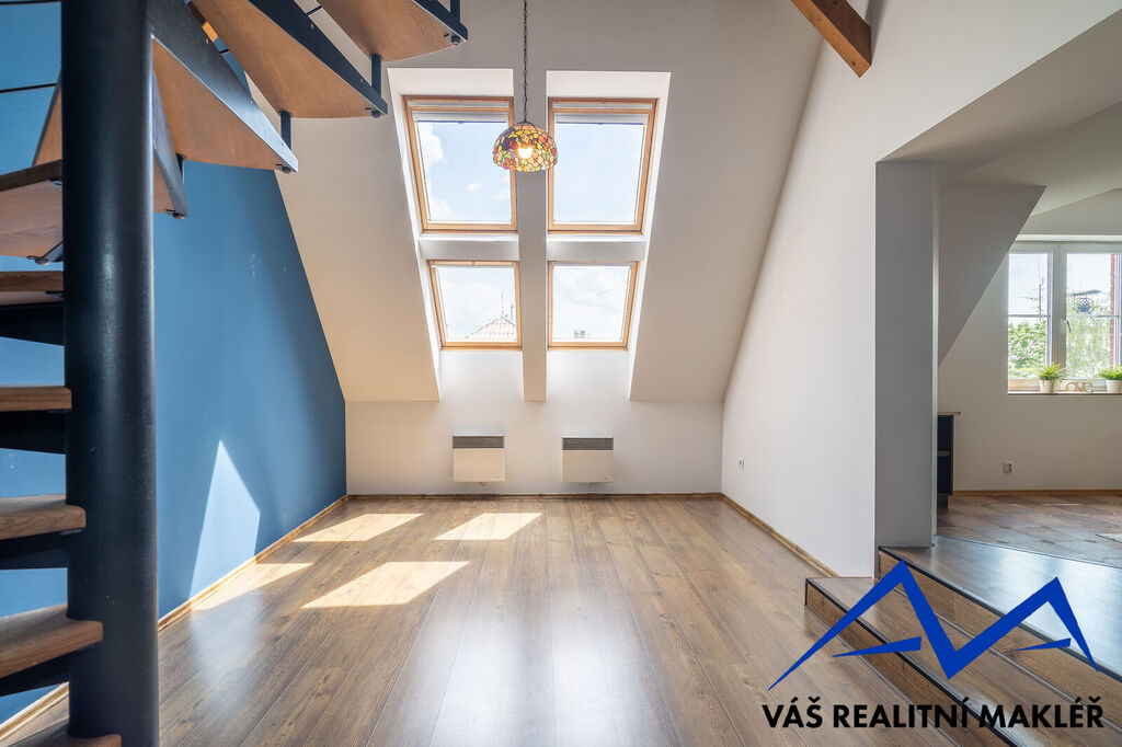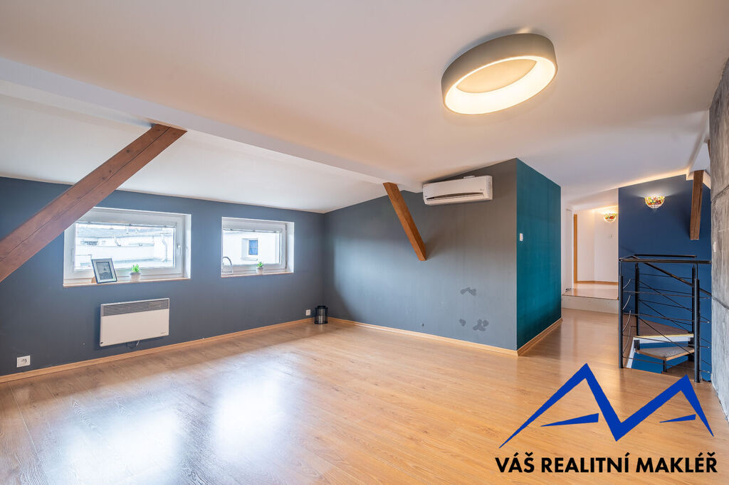 2. patro bytu - obývací pokoj, koupelna s vanou a WC, ložnice, šatna, 2x pokoj, 2x půdní prostor.