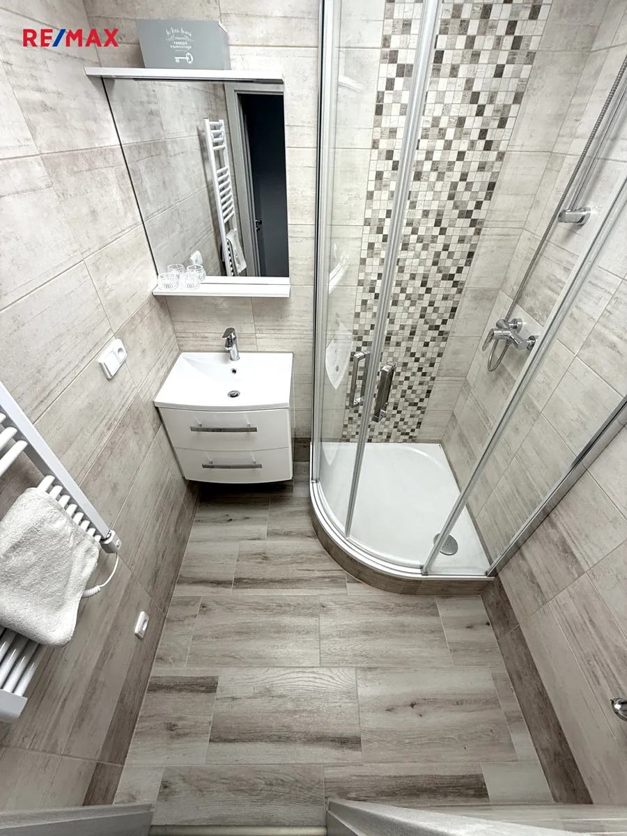koupelna se sprchovým koutem, umyvadlo s koupelnovou skříňkou