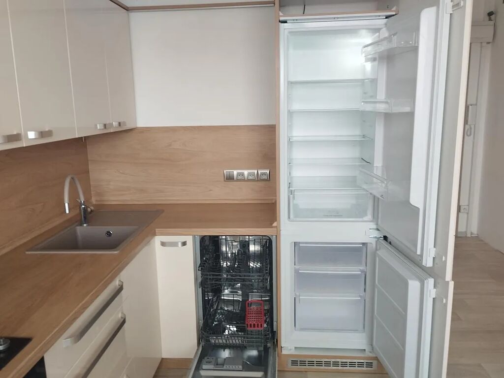 Kuchyňská linka je vyrobena na míru a vybavena vestavnými spotřebiči plynovou varnou deskou, troubou, digestoří, myčkou, vestavnou lednicí s mrazákem a mikrovlnnou troubou. Byt se pronajímá částečně vybavený (sedací souprava, šatní skříň, postel).