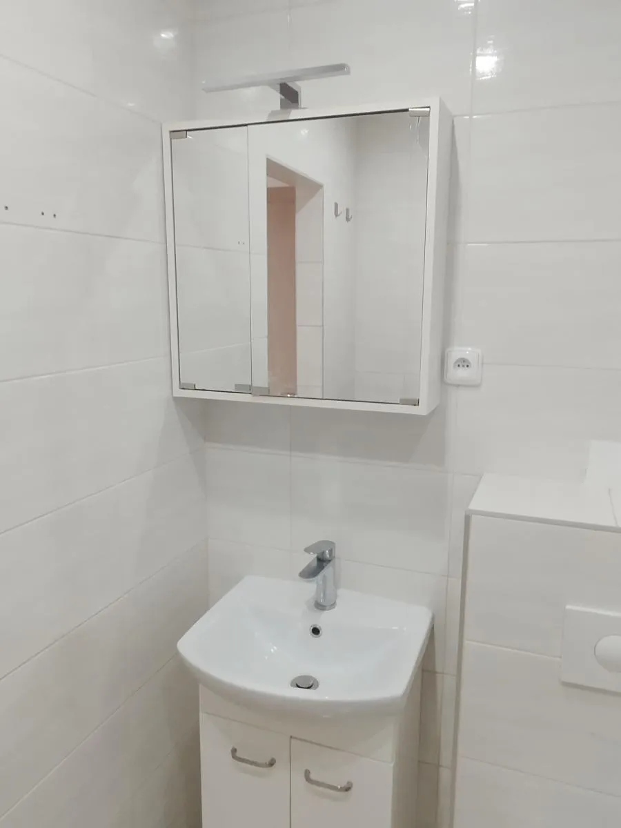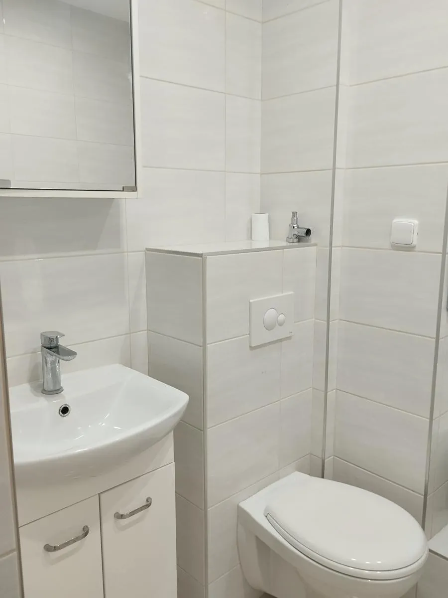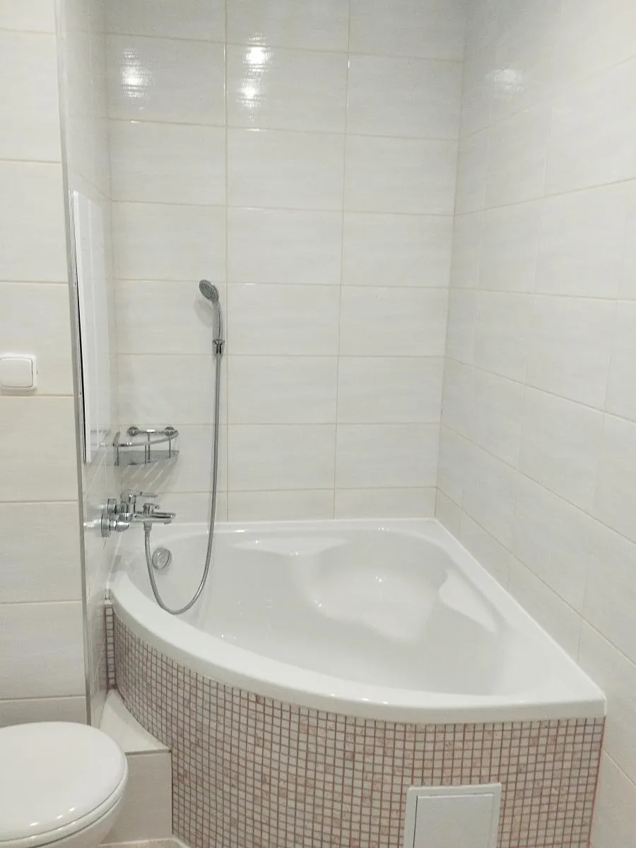Koupelna je vybavena rohovou vanou, umyvadlem s úložným prostorem, zrcadlem s osvětlením a závěsnou toaletou. V celém bytě jsou nové podlahy a výmalba. K bytu náleží sklepní kóje. Dům je zateplený, udržovaný a vybavený výtahem.
