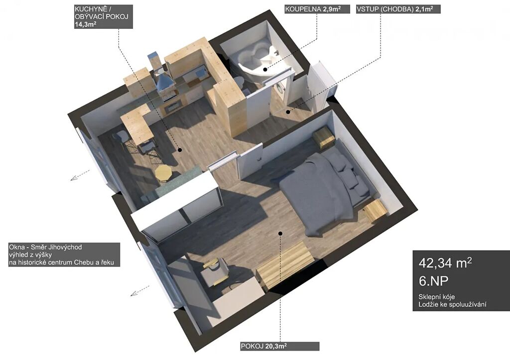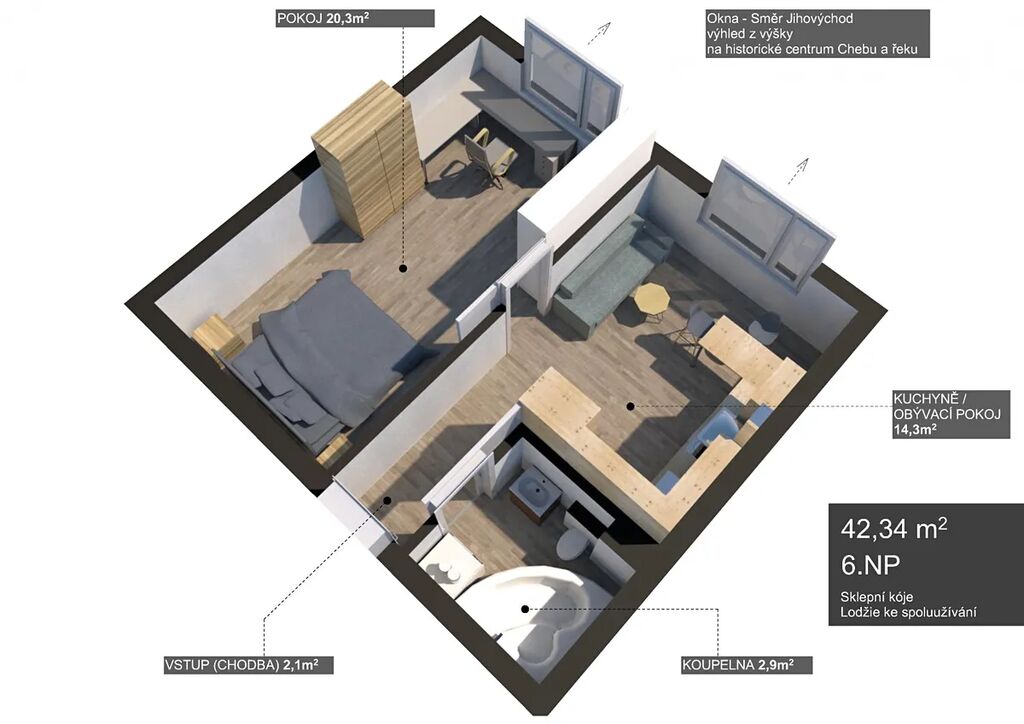 Nabízíme k pronájmu byt o dispozici 1+1 a výměře 42,34 m, který se nachází v 6. patře panelového domu s výtahem. Byt je po kompletní rekonstrukci, působí moderně a čistě. Z oken je krásný výhled na historické centrum Chebu.