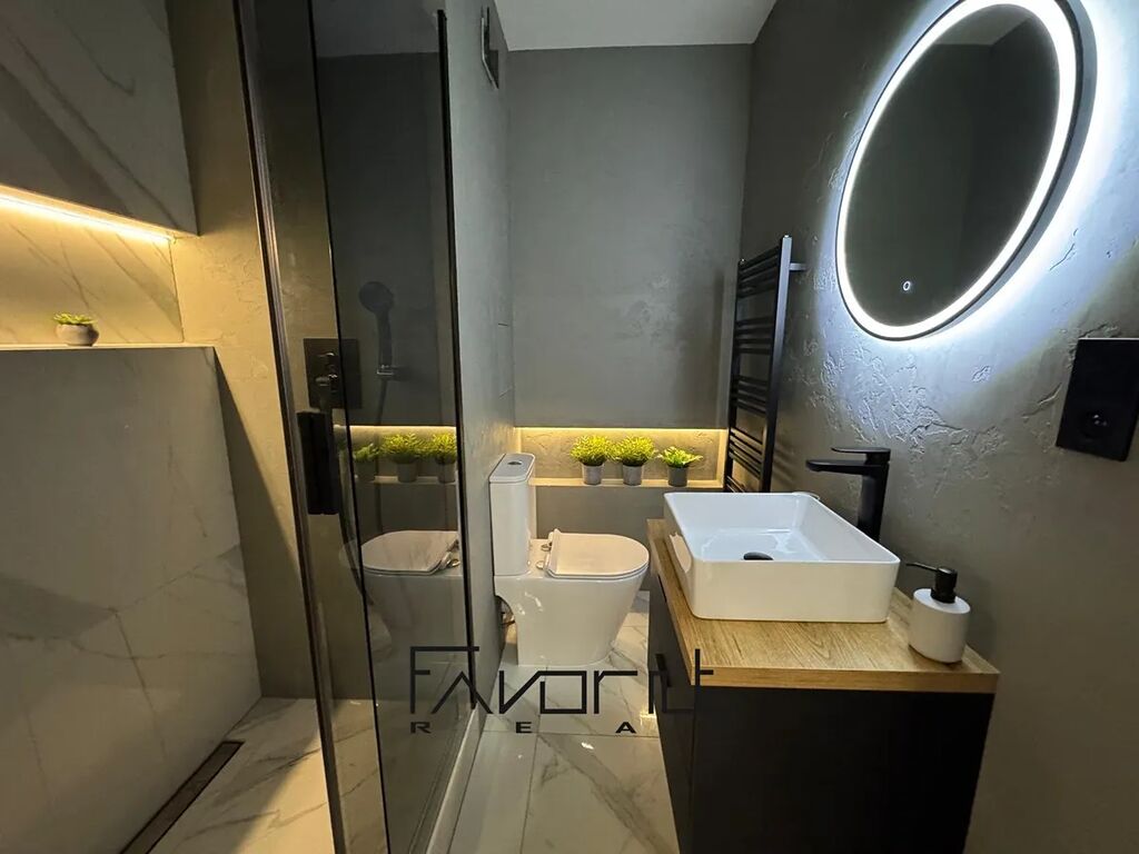 Koupelna je zděná. Je zde sprchový kout, nové obklady, dlažba, umyvadlo se skříňkou, baterie, podsvícené zrcadlo.