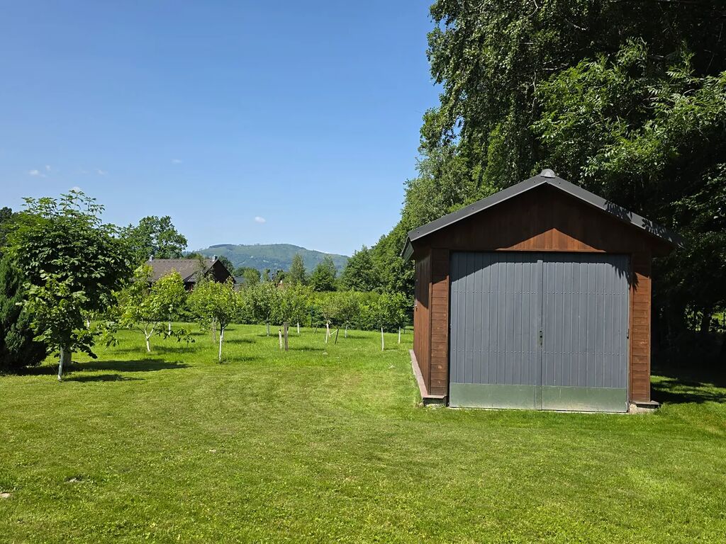 s důmyslně postaveným zahradním domkem na uskladnění nářadí a zahradní techniku.