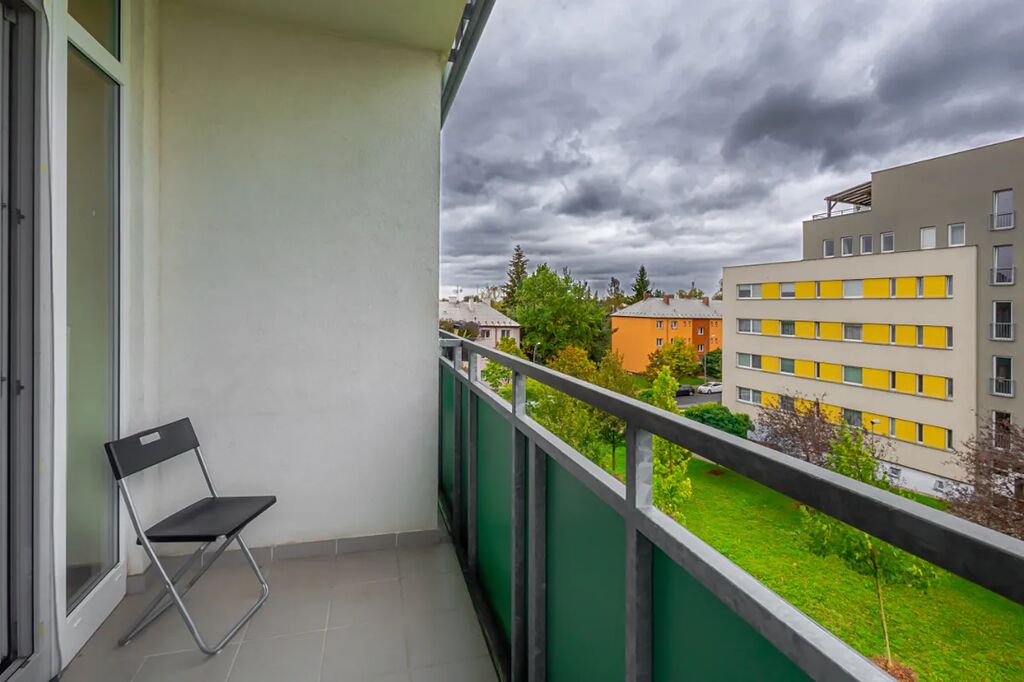 V bytě je velká předsíň s věšákovou stěnou a pračkou, koupelna s rohovou vanou a umyvadlem (otopný žebřík, skříňka, zrcadlo, ventilátor, místo pro pračku), samostatné WC s bidetovou sprchou a umyvadlem, útulná ložnice s vestavěnou skříní, pěkný obývací pokoj s jídelním koutem a moderní kuchyňskou linkou na míru. Kuchyň je plně vybavena elektrickými spotřebiči - el. trouba, myčka, sklokeramická varná deska, digestoř, vestavěná lednice s mrazákem, MW, kávovar, dřez). V pokoji stůl + 2 židle, skříňka. Z obývacího pokoje je vstup na balkon (stůl +2 židle, úložný box).