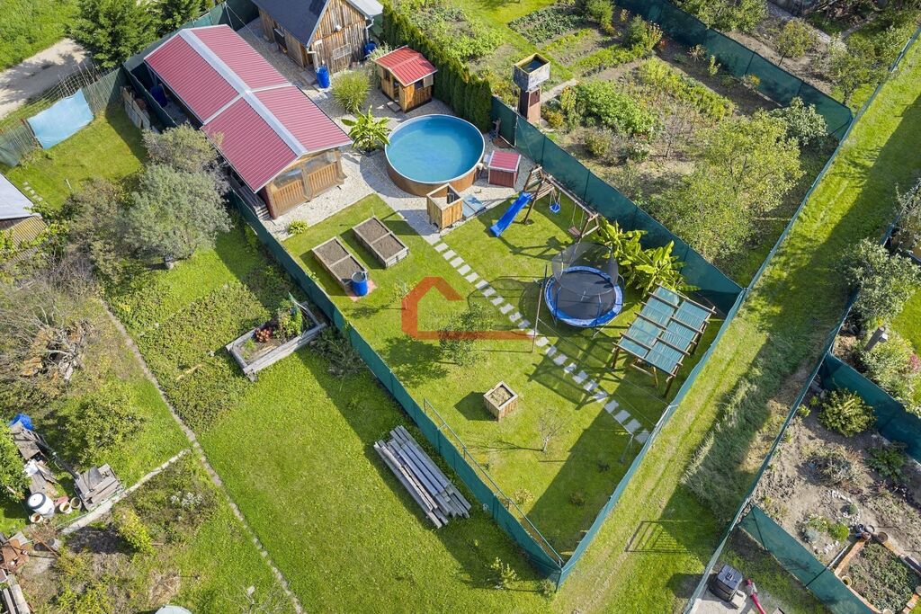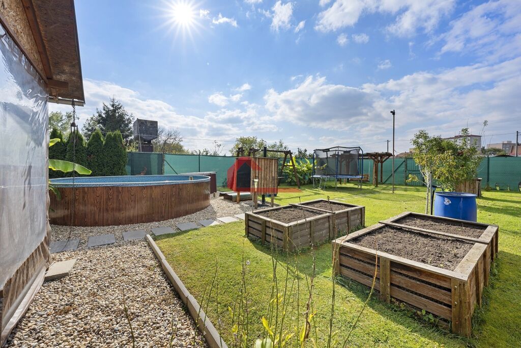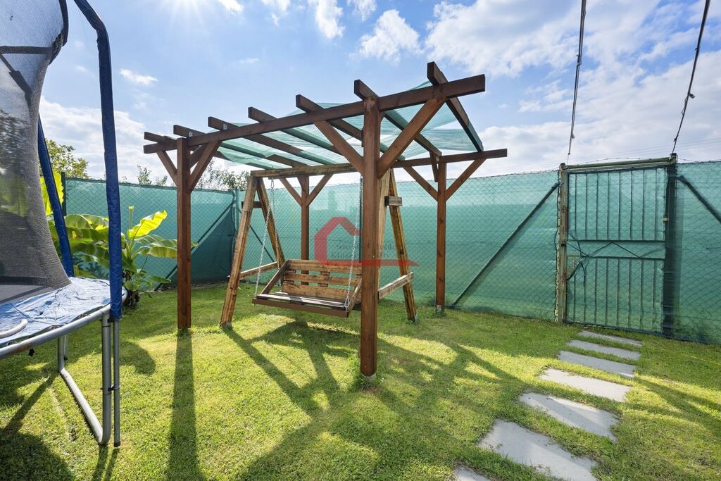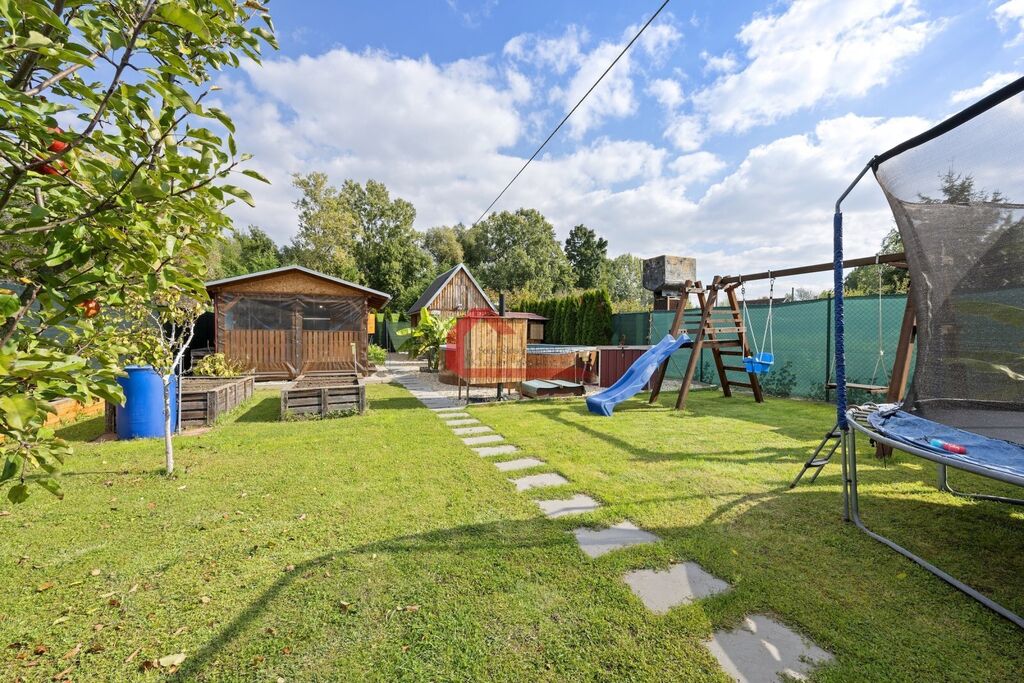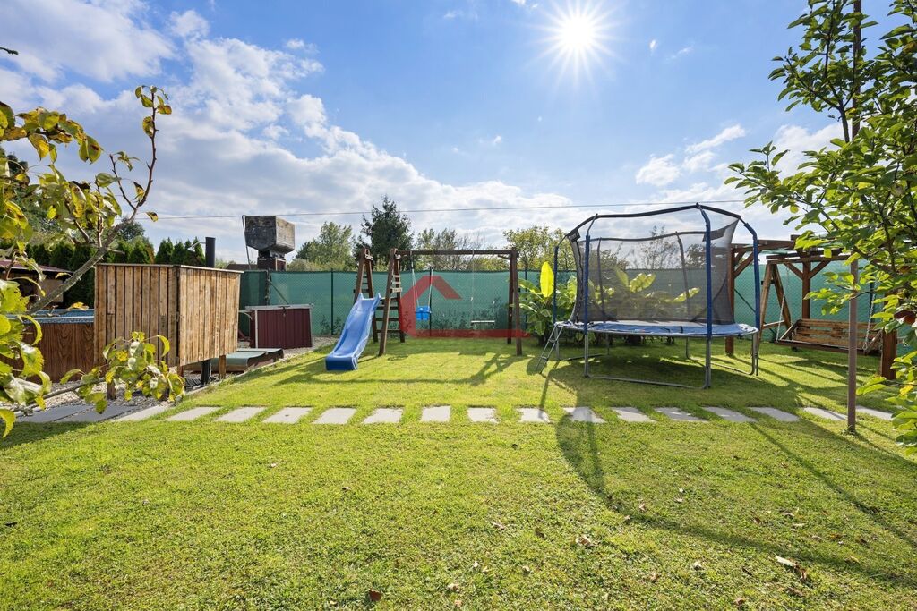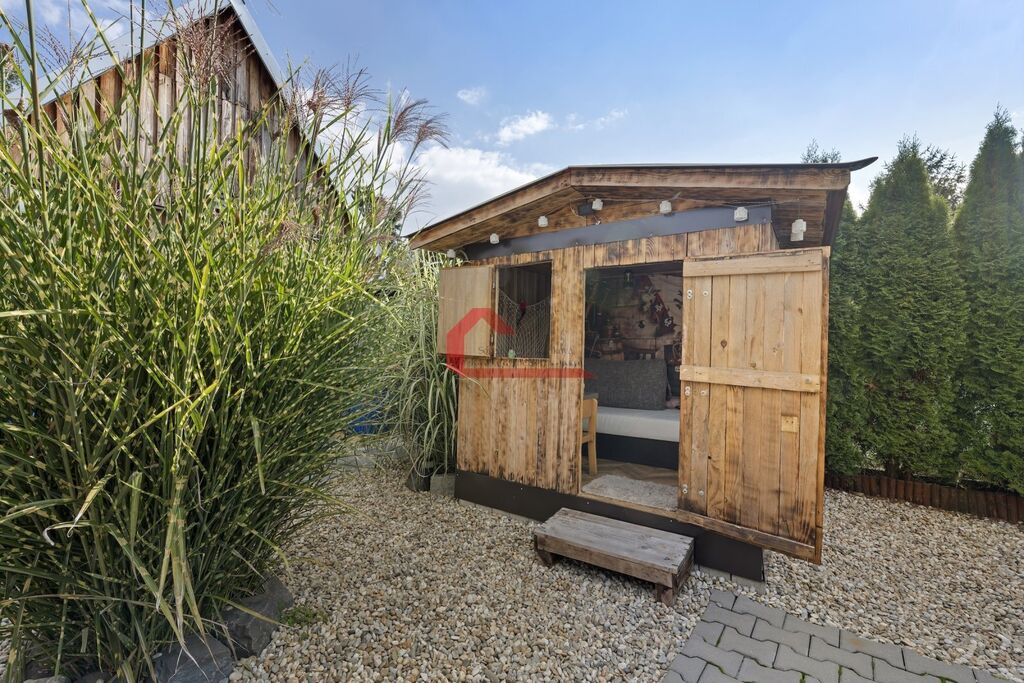Na své si zde dojdou i děti, na zahradě je rovněž dřevěný dětský zahradní domeček, trampolína , průlezka se skluzavkou, houpačka a v neposlední řadě i nadzemní bazén s technikou a nápaditě zřízenou solární sprchou.