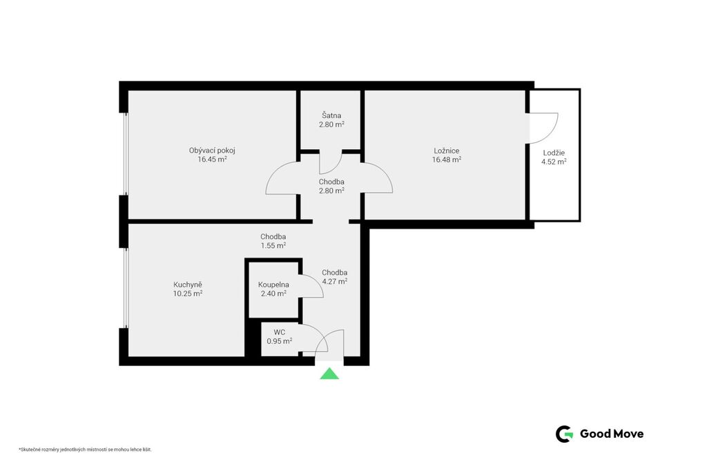 - Ložnice/dětský pokoj (16 m²) s přístupem na lodžii (4 m²) orientovanou do zeleně, poskytující soukromí a prostor pro relaxaci