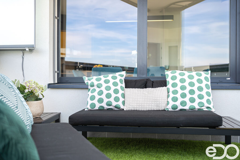 - Vaše soukromá oáza: Z obývacího pokoje vstoupíte na prostornou zasklenou terasu (9,4 m²) s umělým trávníkem – ideální místo pro relaxaci po celý rok.