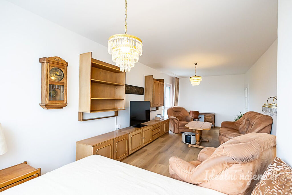 Byt je částečně vybavený, takže usnadní start do nového bydlení. Kuchyně prošla rekonstrukcí a nabízí moderní linku s varnou deskou, elektrickou i mikrovlnnou troubou, digestoří, myčkou, lednicí s mrazákem a jídelním koutem. Obývací pokoj je útulně zařízen pohodlnou sedací soupravou, konferenčním stolkem, televizí, praktickým úložným prostorem a doplněn postelí a pracovním stolem s židlí. Dva samostatné pokoje poskytují dostatek místa a lze je využít jako ložnici, dětský pokoj nebo pracovnu. Koupelna je vybavena vanou, umyvadlem a pračkou, toaleta je samostatná. Součástí bytu je i praktická šatna.