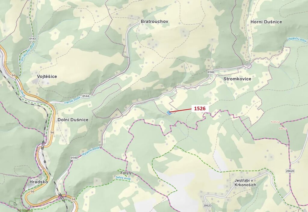 Lesní pozemek o výměře 2 579 m2, parcelní číslo 1526, podíl 1/1, katastrální území Bratrouchov, obec Jablonec nad Jizerou, obec s rozšířenou působností Jilemnice, okres Semily, Liberecký kraj. Po těžbě.
