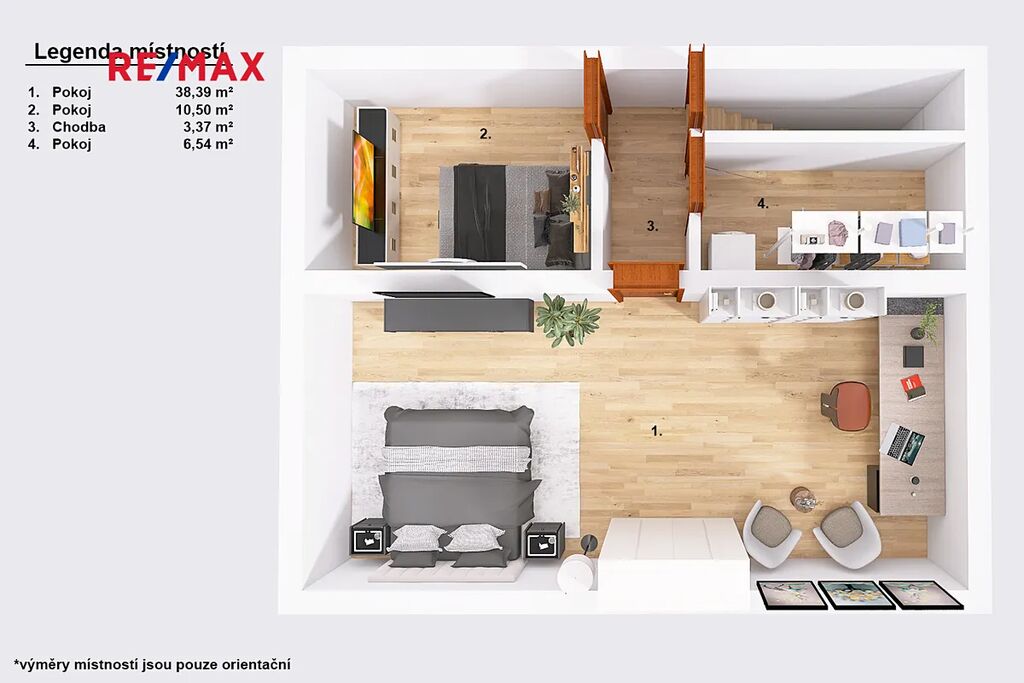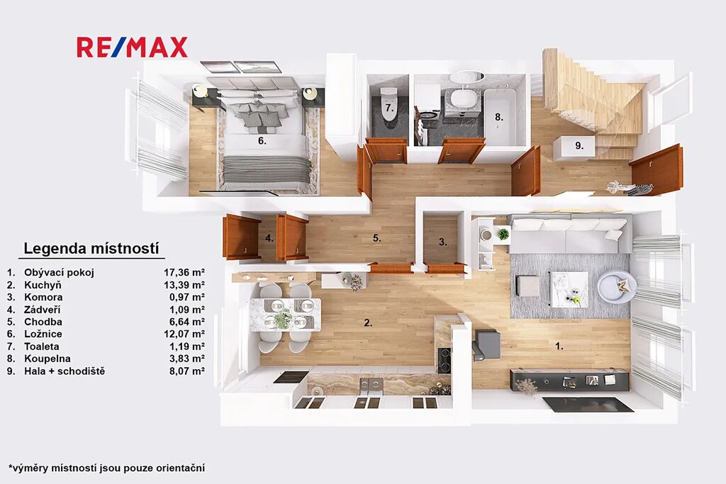Nabízí dispozici 5+1, ideální pro každodenní rodinný život. V přízemí vás čeká obývací pokoj, kde se budete scházet u společných večeří. Nechybí kuchyně vonící čerstvě upečeným chlebem, ložnice, koupelna a toaleta. V patře pak najdete tři další pokoje – dětské království, pracovnu nebo pokoj pro hosty. A když vaše sny porostou, půda nabízí možnost vybudovat další obytné místnosti.