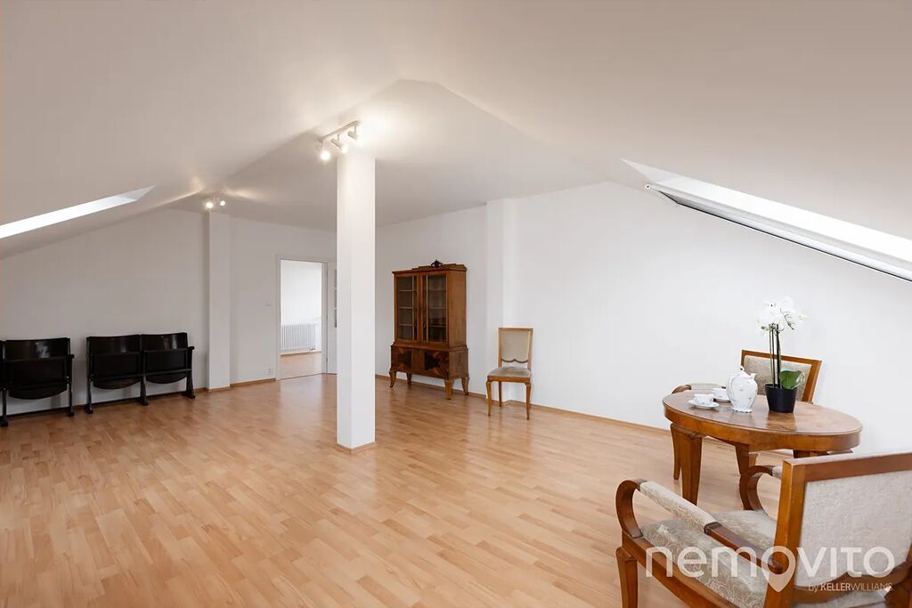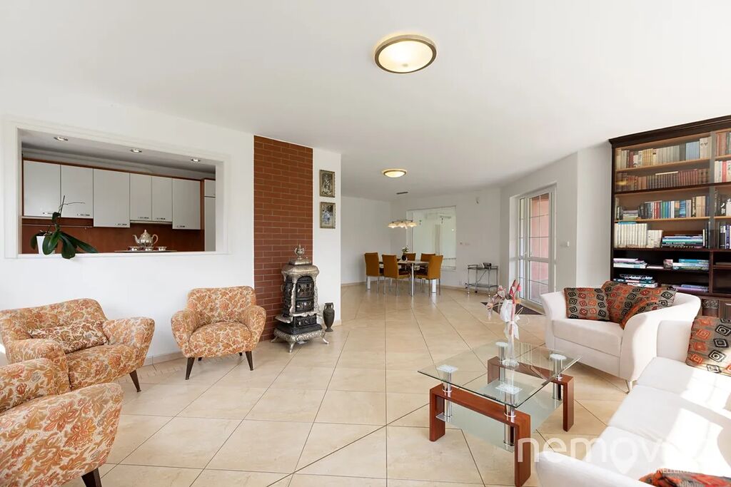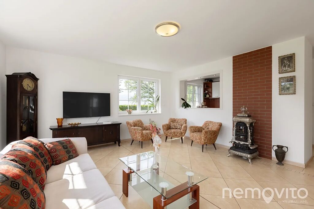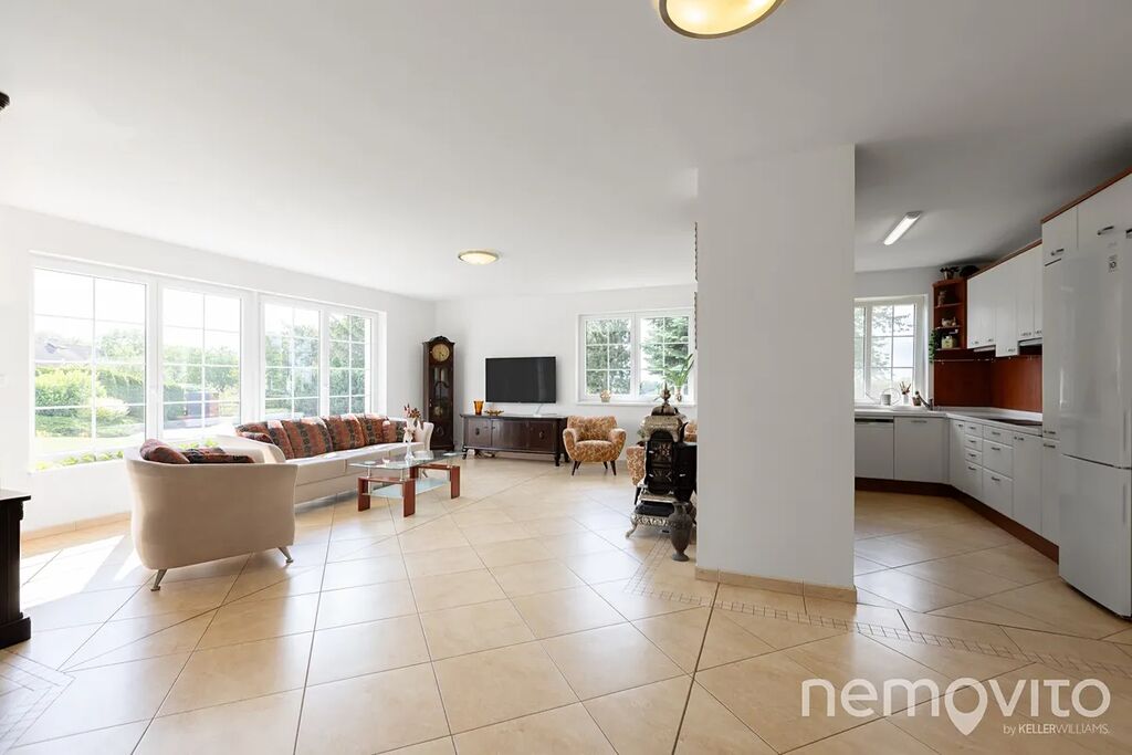 Dominantou prvního podlaží je obývací prostor s průhledem do prostoru s vnitřním bazénem. Zhruba 60 m2 v sobě spojuje prostor pro posezení, jídelnu a kuchyni. Společným jmenovatelem prvního podlaží jsou velká okna, která zejména v prostoru obýváku s kamny poskytují příjemné výhledy do zelené zahrady. Ačkoliv je kuchyně původní, je mimořádně zachovalá, kvalitní (Technistone) a také prostorná (linka do tvaru U s průhledem do obýváku). Prostor pro jídelnu je umístěný u průhledu k bazénu v části s výstupem na terasu.
