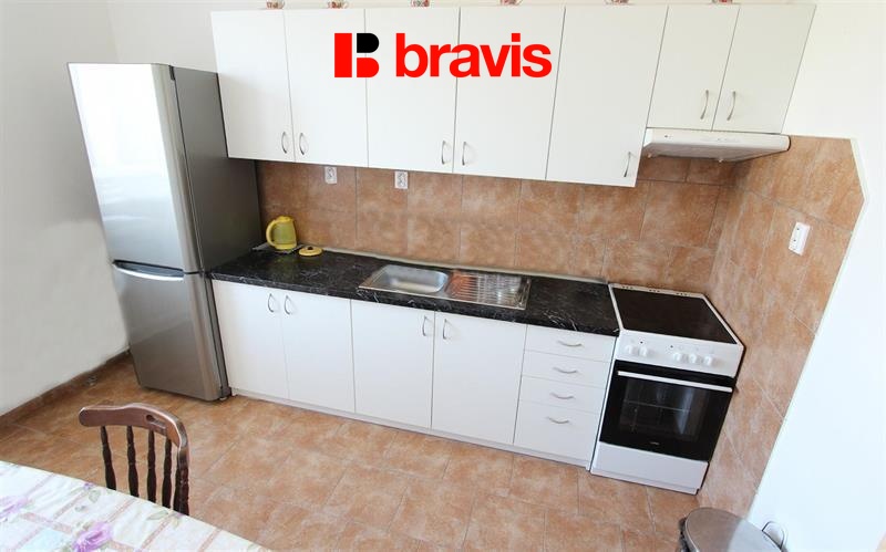 V kuchyni je sklokeramická deska s troubou, lednice s mrazícím boxem a jídelní stůl s židlemi. Z kuchyně je možnost vstoupit na balkón, který je orientován do vnitrobloku.