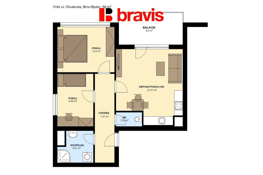 Pronájem bytu 3+kk, Brno, Chvalovka, 56 m2