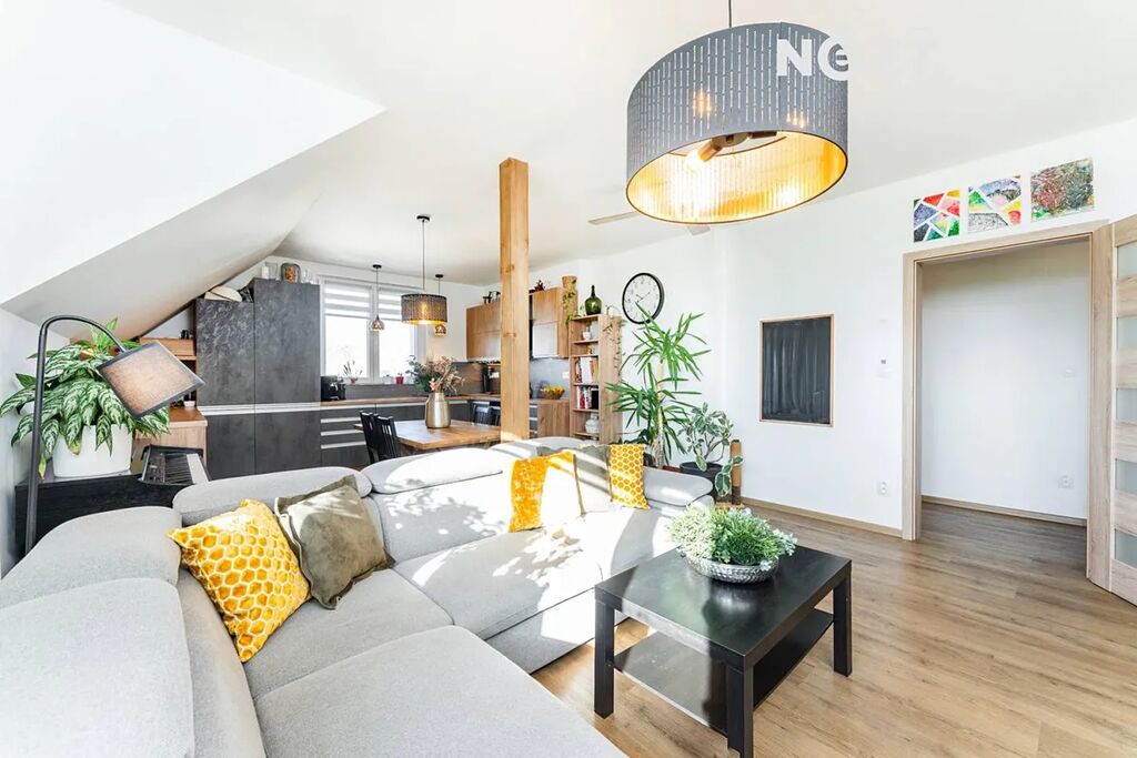 Byt prošel v roce 2020 kompletní rekonstrukcí provedenou s citem pro detail a kvalitu. Při rekonstrukci vznikl i výrazný estetický prvek v podobě přiznaného trámu v obývacím pokoji, který prostoru dodává jedinečnou atmosféru. Dispozice nabízí obývací pokoj s kuchyňským koutem a jídelnou, ložnici s vlastní šatnou a vstupem na balkón a dva samostatné pokoje. Samozřejmostí je koupelna s prostorným sprchovým koutem a samostatná toaleta.