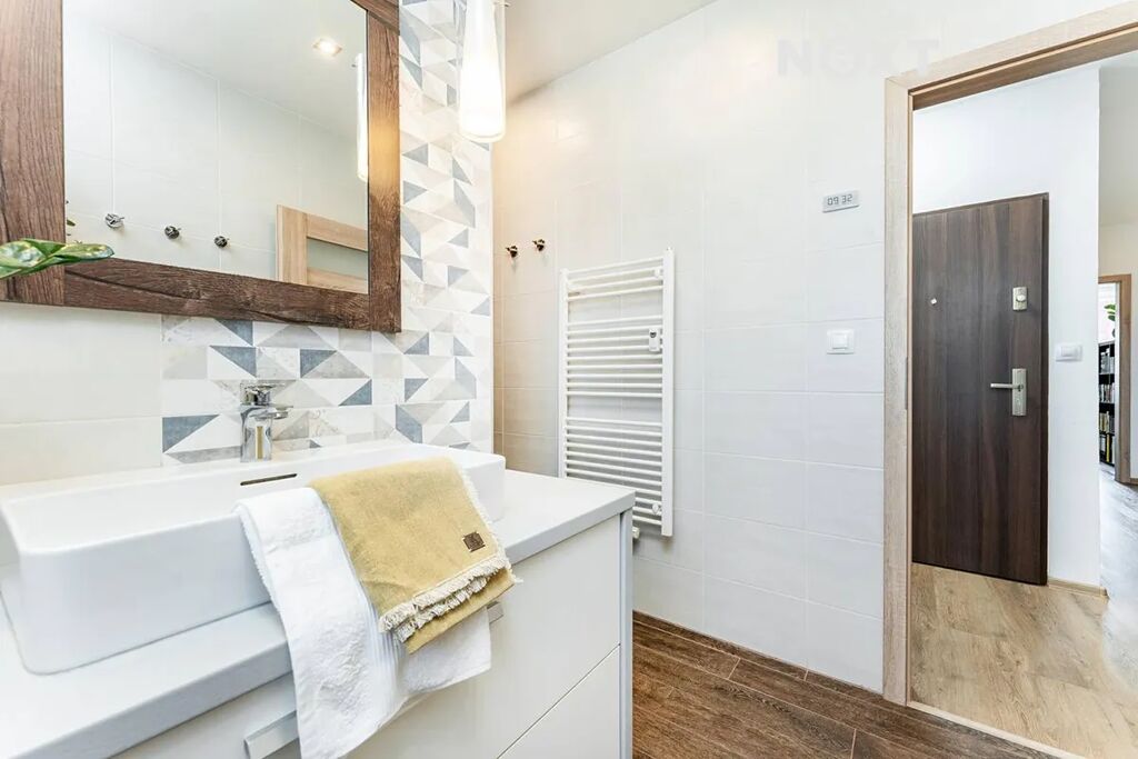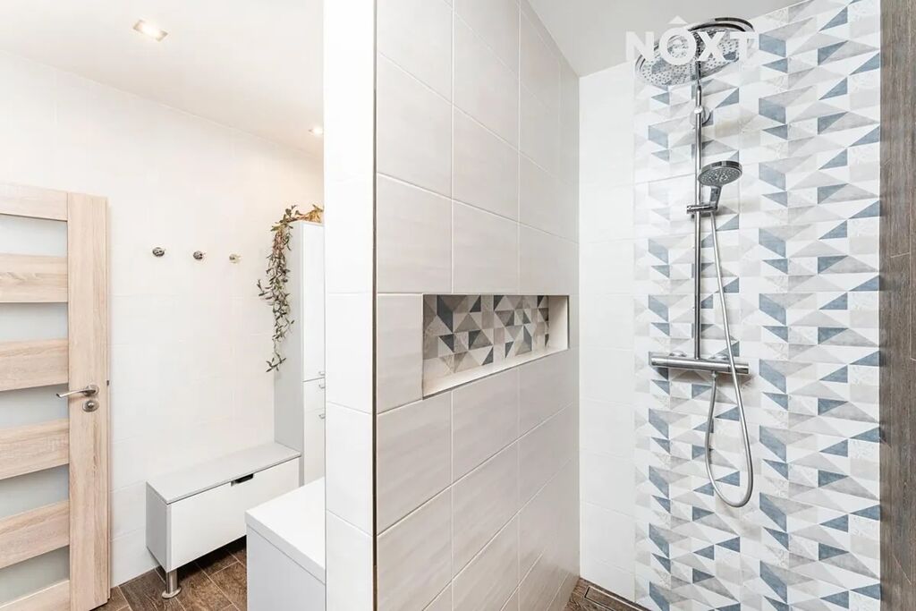 Velkou výhodou je prakticky umístěná technická místnost v rohu bytu, která chytře využívá prostor a výrazně tak rozšiřuje úložné možnosti. Byt je tak nejen esteticky povedený, ale i funkčně velmi dobře řešený.