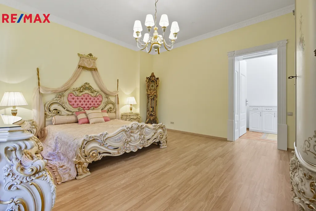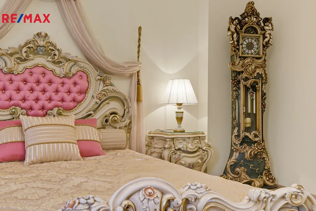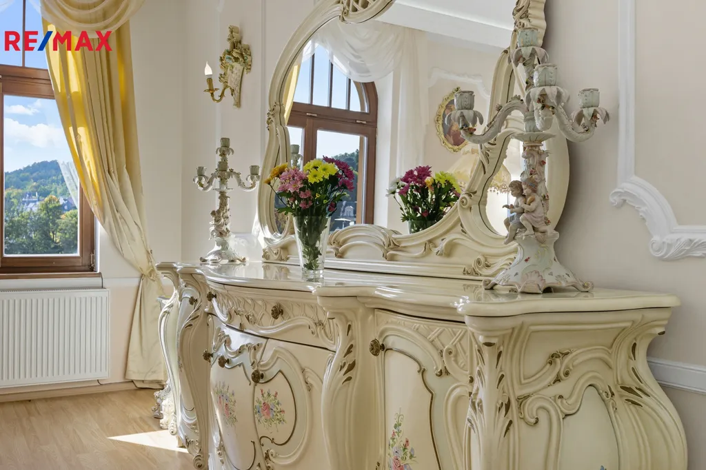 - Ložnice jako z pohádky: postel s bohatě zdobeným čelem a baldachýnem, nábytek ve stylu Ludvíka XV., impozantní toaletka a zdobné závěsy