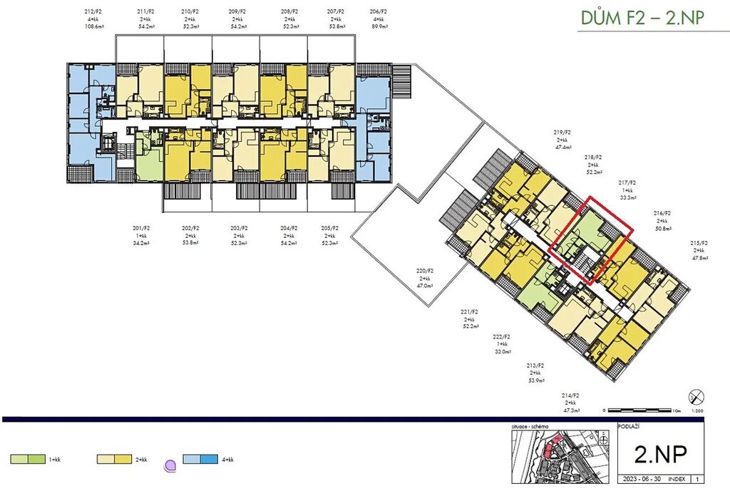 Byt 1+kk o velikosti 33,3 m2 + lodžie 4,2 m2 se nachází ve 2. nadzemním podlaží (z celkových šesti) s orientací na severozápad.