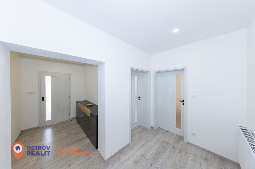 Po vstupu vás přivítá světlé zádveří a prostorná hala, odkud plynule přejdete do otevřeného obývacího prostoru s výstupem na dvůr.