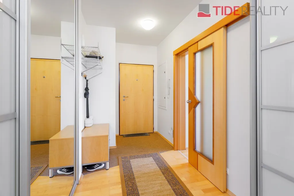 Za bezpečnostními vstupními dveřmi vcházíte do předsíně (18m2) se samostatnou prostornou komorou a s velkou vestavěnou skříní. Z centrální chodby jsou vstupy i do všech místností v bytě: do třech ložnic (18,17 a 16m2), koupelen a dále do velmi světlého obývacího pokoje s kuchyní (34m2) propojeného s prostorným balkonem (2m x 4,8m), kam se vejdou i pohodlná křesílka a případně i gril. Všechny ložnice jsou orientované na sever do zeleně, nabízí tak uklidňující a ničím nerušený výhled do lesoparku a hlavně klidný spánek při otevřeném okně. Tento byt má dále k dispozici 2 koupelny. Koupelna se sprchou, umyvadlem a WC se nachází u hlavní ložnice, ostatní pokoje (dětské pokoje) sousedí s koupelnou vybavenou vanou, dvěma umyvadly, WC a přípojkami na na pračku a sušičku.