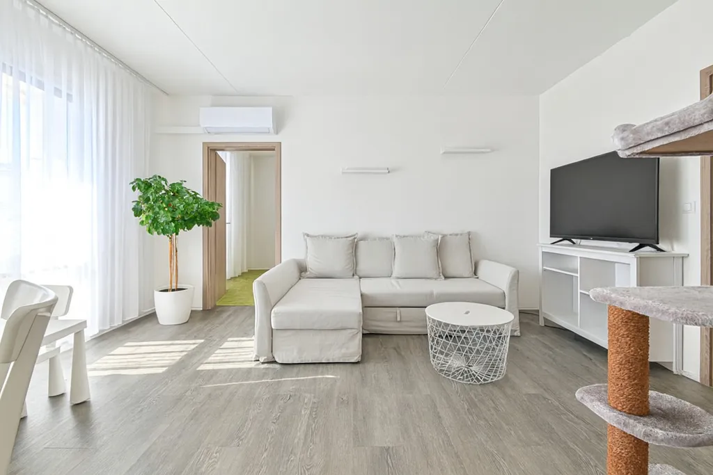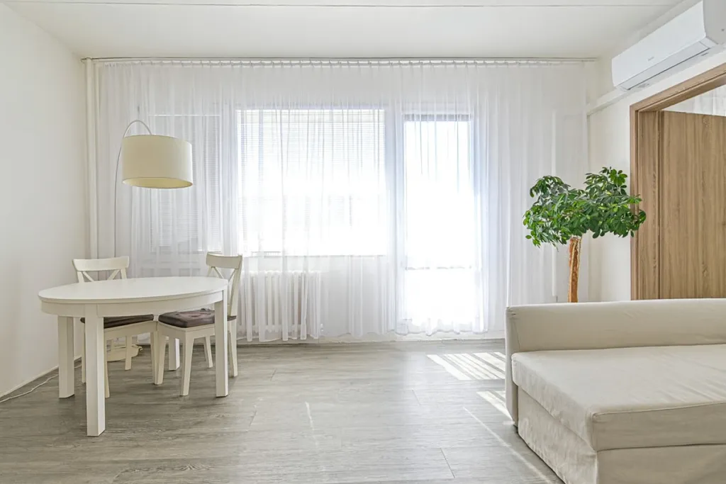 Nemovitost se prodává plně vybavená dle fotografií. Kuchyně je kompletně zařízena myčkou, lednicí, varnou deskou, digestoří, sušičkou, elektrickou i mikrovlnnou troubou. Obývací část nabízí klimatizaci, pohodlnou sedačku, televizi a jídelní set. V ložnici se nachází manželská postel, komoda a šatní skříň. Obývací pokoj je jedinou průchozí místností v bytě.