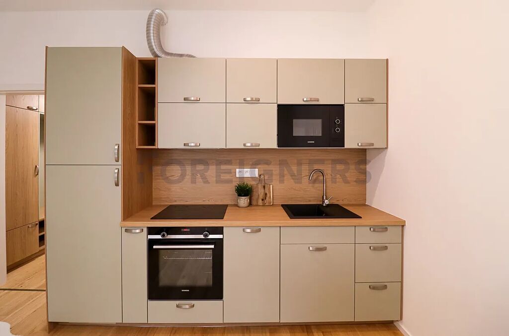 Hlavní obytný prostor s moderní kuchyňskou linkou je kompletně zařízen prémiovými spotřebiči – lednicí, mrazákem, myčkou nádobí, troubou a varnou deskou.